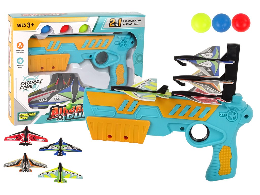 Datorită ușurinței sale, aeronava poate zbura la o distanță de câțiva metri. Fiecare fan al concursurilor de tir va putea exersa cele mai lungi zboruri cu un astfel de shooter si apoi sa organizeze o competitie cu prietenii. O altă opțiune distractivă este tragerea cu bile de plastic colorate. Setul include: - lansator - 4 piese de avioane - 3 bile colorate
