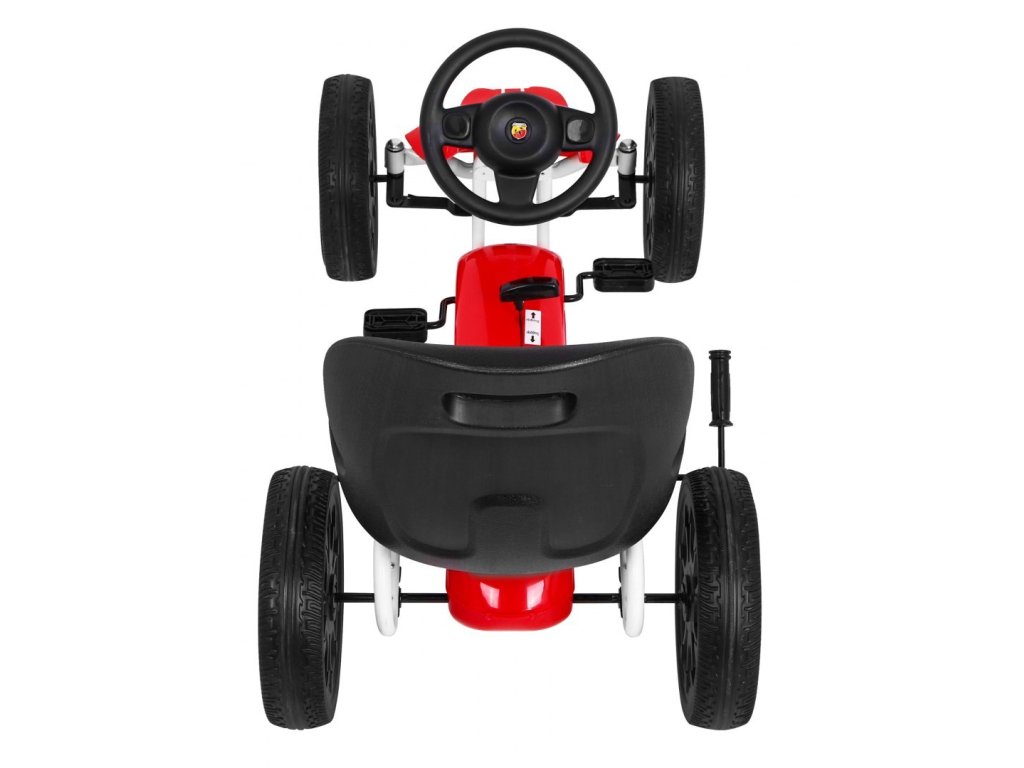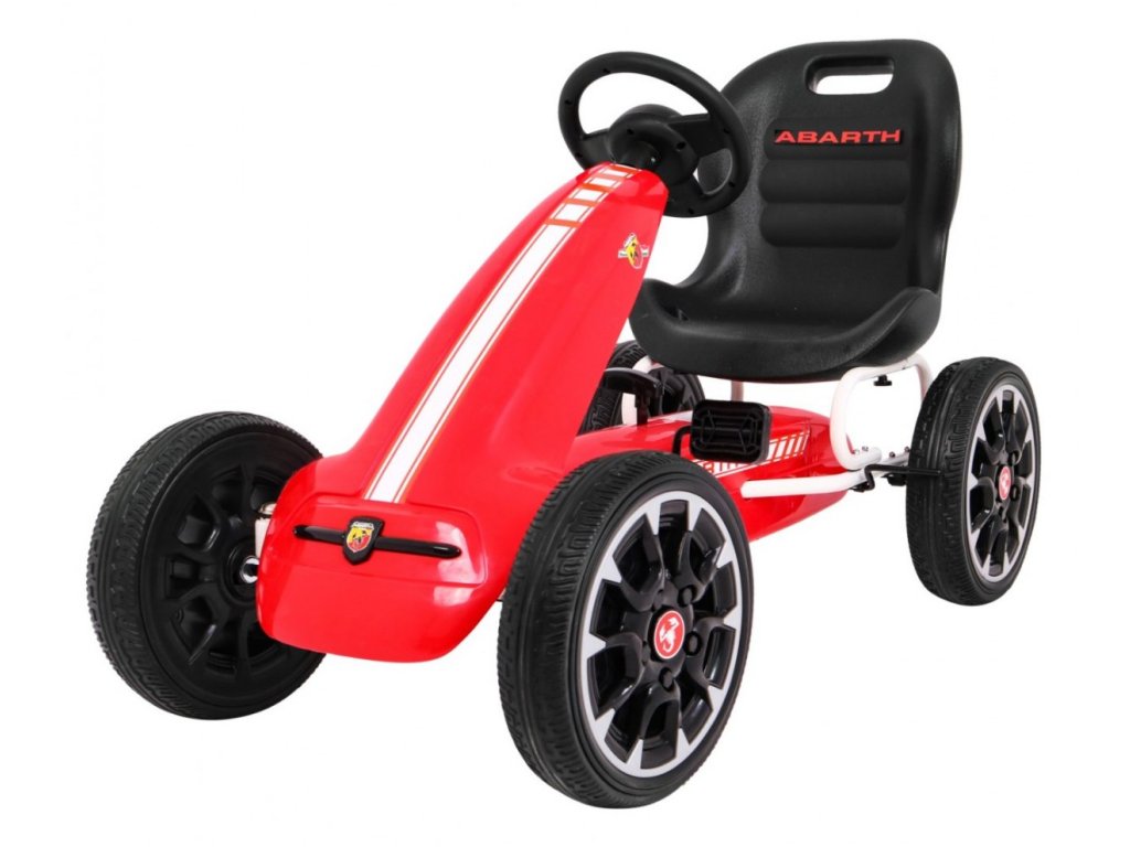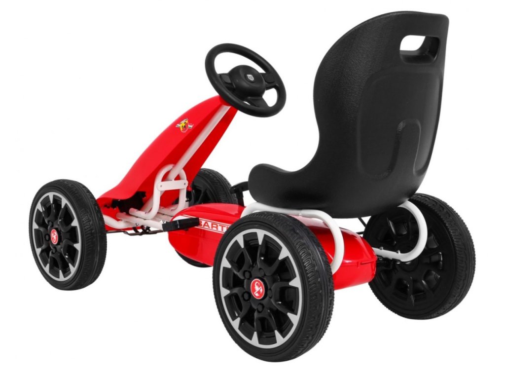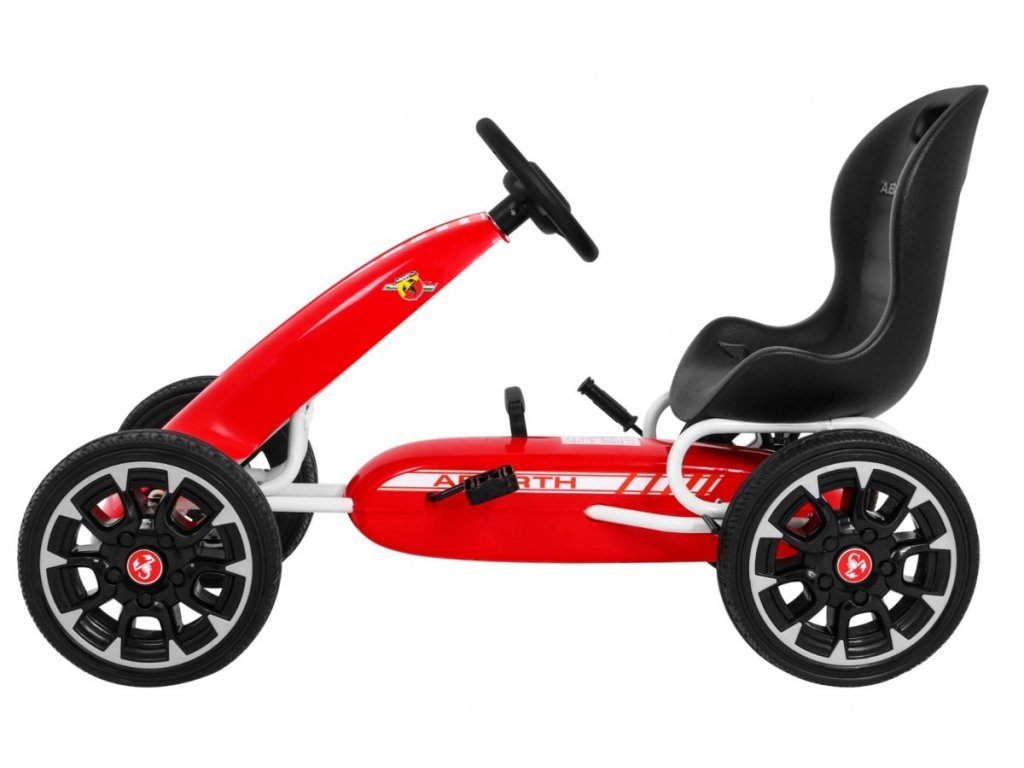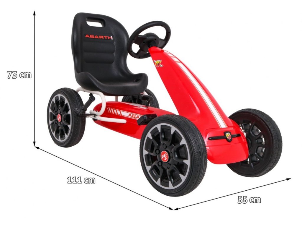 Kartul cu pedale pentru copii Abarth este o pedală pentru copii foarte bine realizată, cu un design modern. Construcția metalică prelucrată cu precizie în combinație cu plasticul de înaltă calitate garantează că go-kartul nu este doar o afacere sezonieră. Pentru siguranța copilului, este inclusă o frână de mână funcțională, iar spătarul înalt al scaunului cu formă ergonomică monitorizează și sănătatea. Scaunul poate fi reglat si in functie de confortul copilului tau. Pedala permite copilului să conducă înainte și înapoi. Roțile de kart sunt realizate din plastic EVA din cauciuc moale, care asigură o aderență perfectă la suprafață. Go -karturile pentru copii sunt o formă excelentă de exerciții pentru copii. Datorită propulsiei umane, este ecologic și fără zgomot.