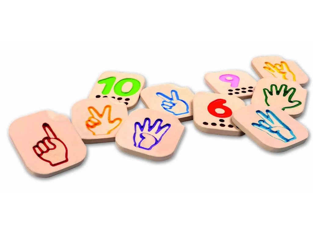 Cuburi din lemn cu două fețe: pe o parte sunt numere proeminente completate cu puncte corespunzătoare valorii, pe cealaltă parte este afișat plastic alfabetul dactil pentru numărul respectiv. Cuburile sunt ușor de apucat și de mutat.