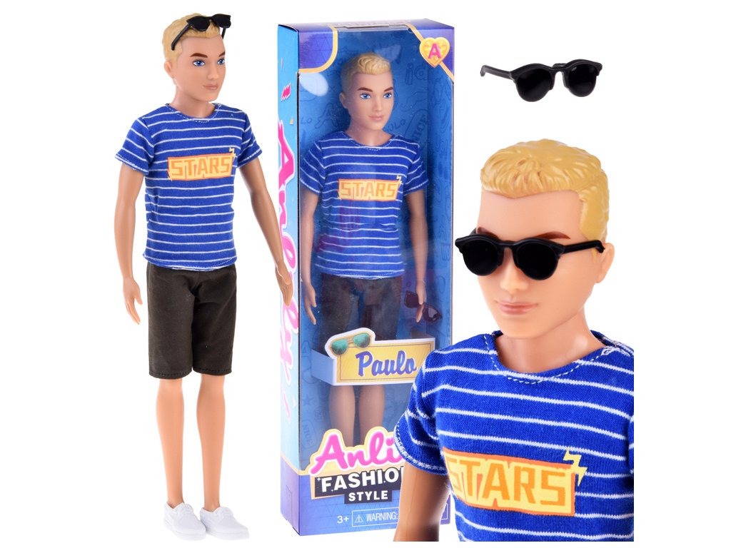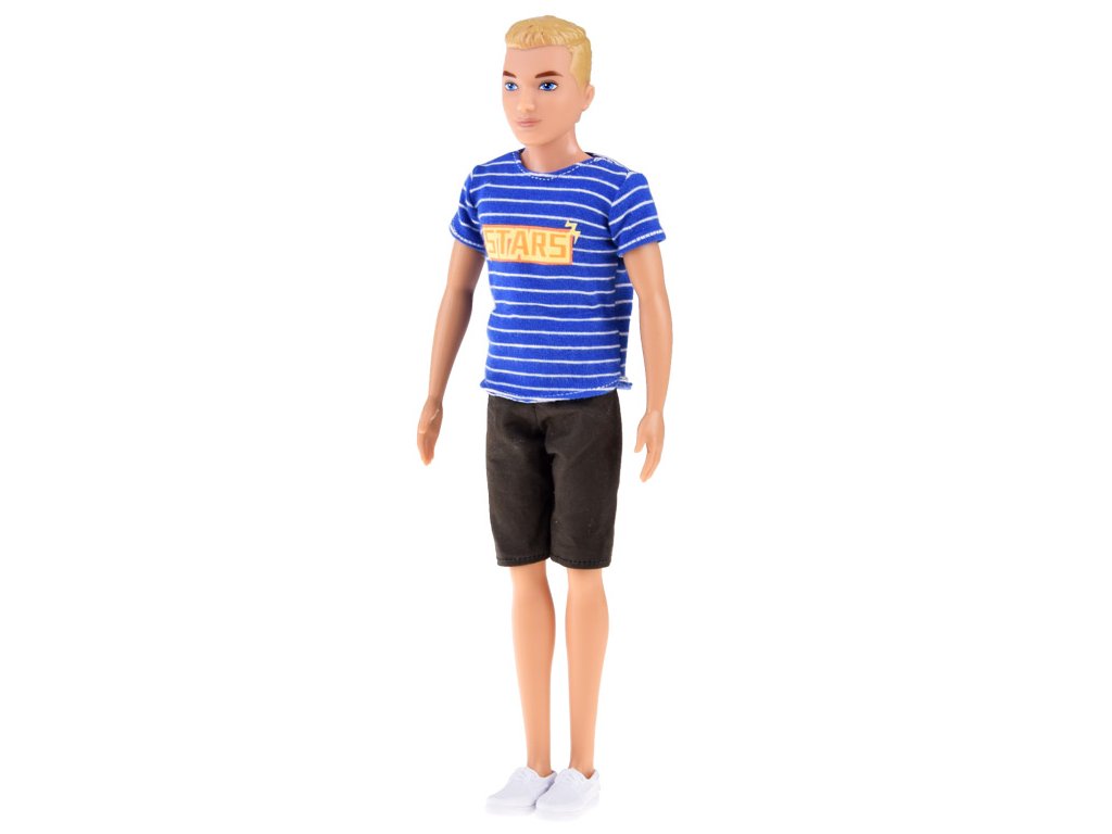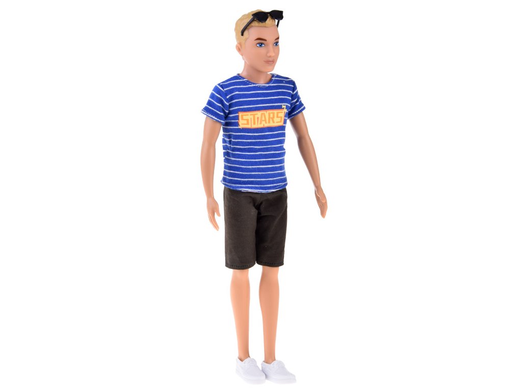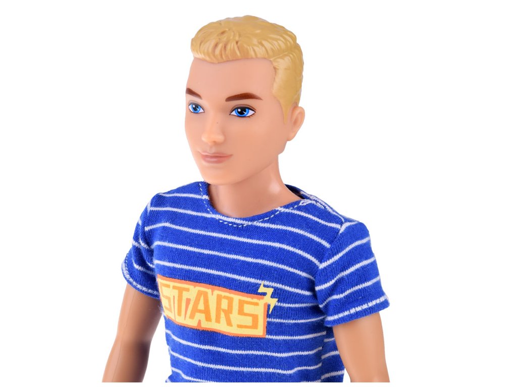 Păpușa stilată este partenerul ideal pentru jocuri cu orice păpușă. Frumos, înalt cu păr blond, îmbrăcat într-un tricou la modă albastru închis cu dungi albe, pantaloni scurți negri și mocasini albi. Are ochelari de soare negri pe nas. Păpușa sport are membre mobile. Jocul cu Ken va fi întotdeauna atrăgător și distractiv.