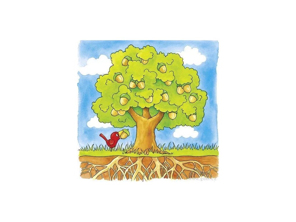 Puzzle-ul arată evoluția stejarului de la o ghindă care germinează până la un copac cu o coroană care produce ghinde. În primele faze, planta este foarte mică și lângă ea încap gândăcei mici sau este depășită de o floare de trifoi. Treptat, depășește plantele și animalele din jur.