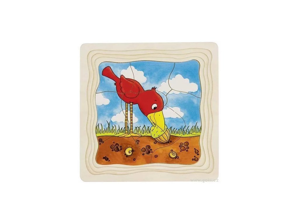 Puzzle-ul din lemn cu patru straturi arată cum dintr-o ghindă mică crește un stejar impunător. Straturile succesive arată transformările plantei și ale mediului înconjurător.