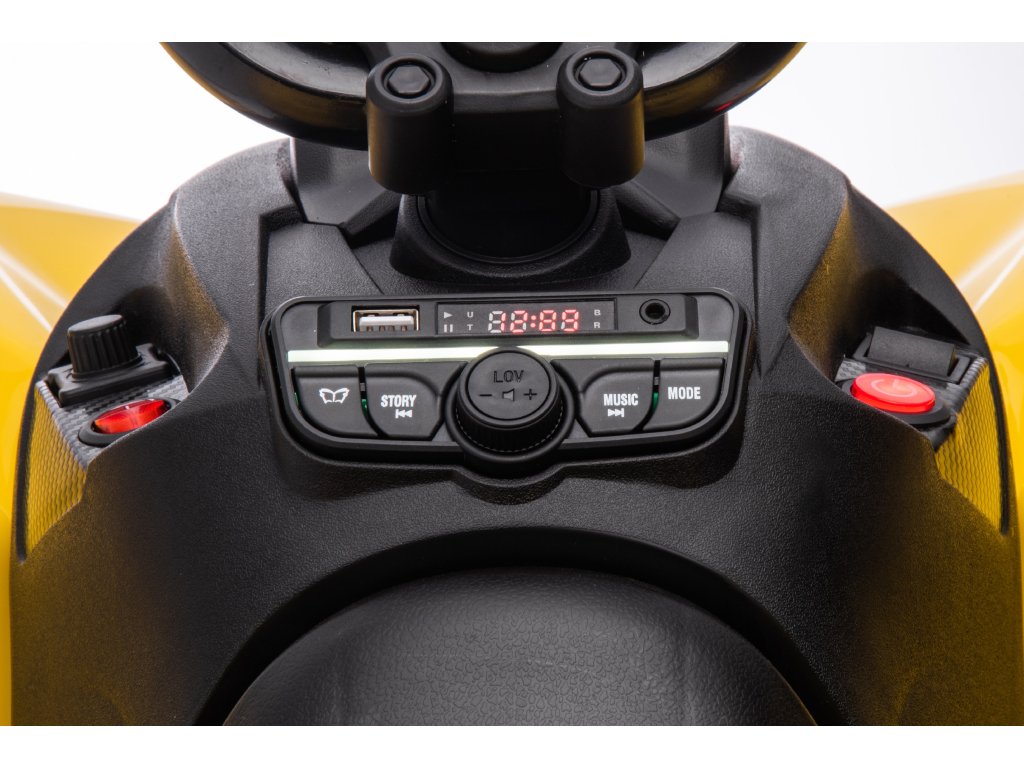 Echipamentul include un panou muzical cu intrări USB, MP3, Radio și Bluetooth. ATV-ul Can-Am are lumini față și spate, permite deplasarea în toate direcțiile și are o capacitate de încărcare de până la 30 kg.