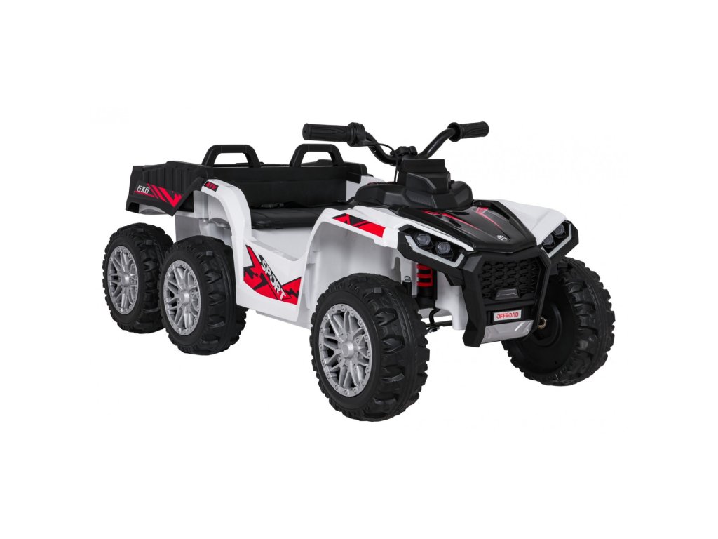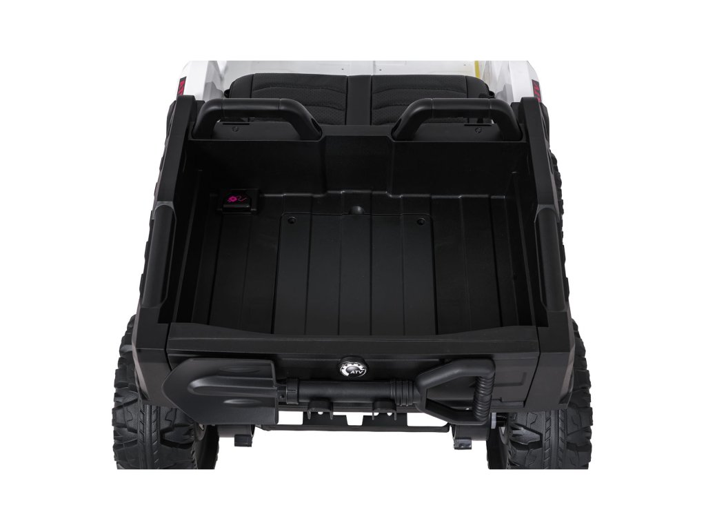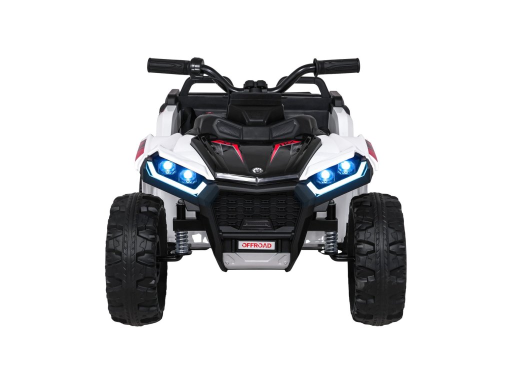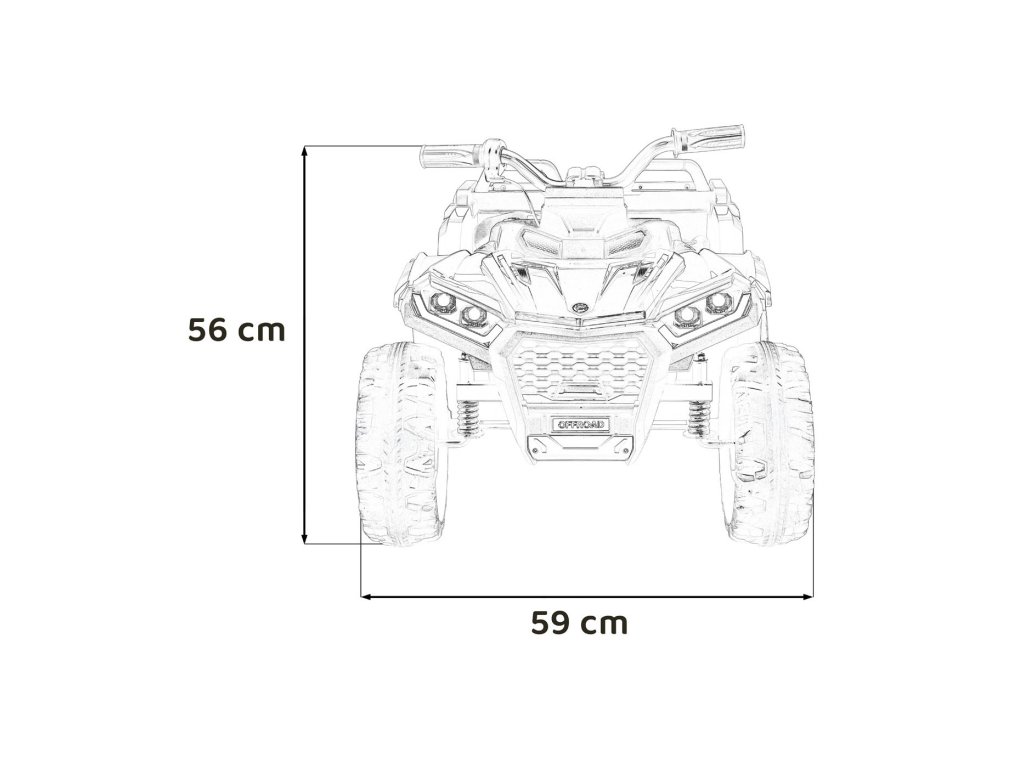 ATV-ul este echipat cu roți silențioase din spumă EVA cu dimensiunile de 26 x 11 cm și suspensie față și spate, ceea ce asigură o călătorie confortabilă și stabilă chiar și pe teren accidentat. Siguranța copilului este asigurată de centurile de siguranță și de un scaun robust din piele ecologică neagră.