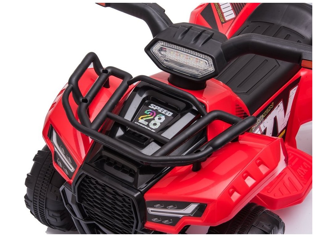 Vehiculul electric cu patru roți este echipat cu un scaun în formă confortabilă, roți cu jante de cauciuc, lumini frontale cu LED-uri și un panou muzical cu intrări MP3 și USB .