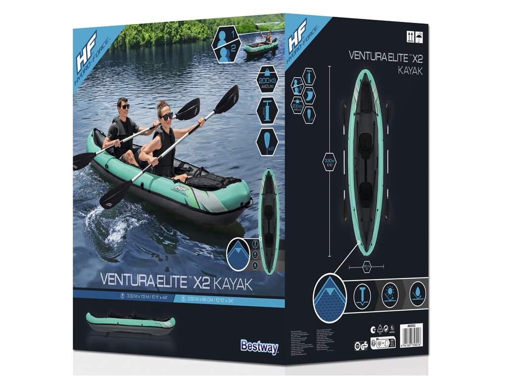 Inspirat de caiacele militare, cel mai recent caiac Ventura Elite X2 , foarte durabil și foarte încăpător, este ideal pentru apă plată și curgătoare. Va fi un însoțitor esențial în excursiile cu caiacul pe râuri, lacuri sau în timpul vacanțelor de vară la mare. Capacitatea de încărcare de 200 kg asigură o utilizare confortabilă pentru doi adulți. Caiacul este realizat din PVC foarte rezistent si are o camera de podea detasabila cu o constructie in profil tubular ce asigura stabilitate.