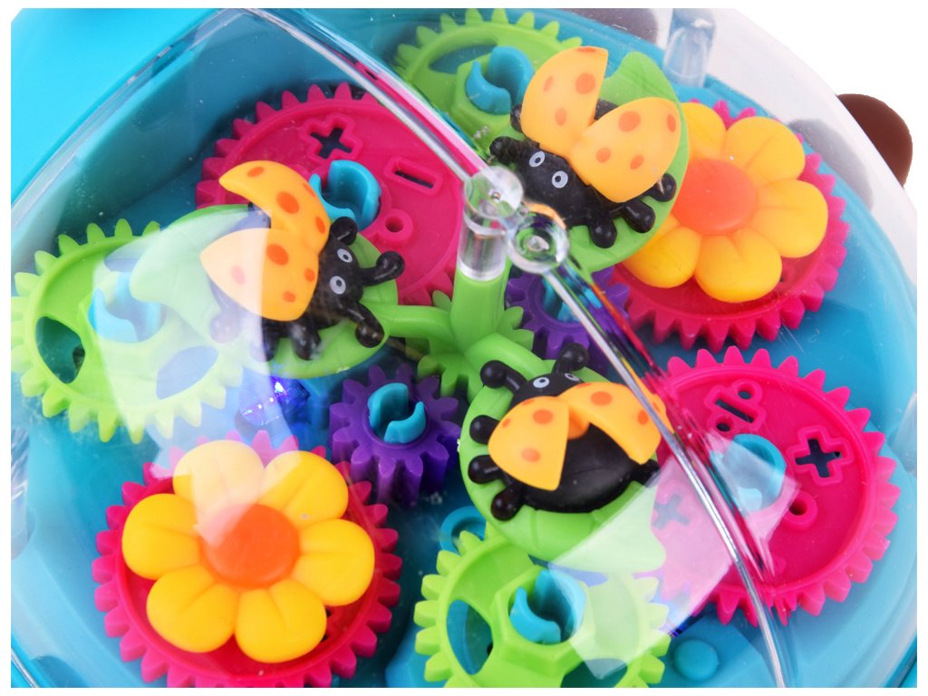 Datorită luminilor colorate, ochii gărgăriței creează proiecții frumoase în formă de stele în dormitor , ceea ce înseamnă că copilul va putea adormi liniștit . Mai departe în interiorul gărgăriței, mici gărgărițe așezate pe frunze verzi dansează pe roți dințate colorate.