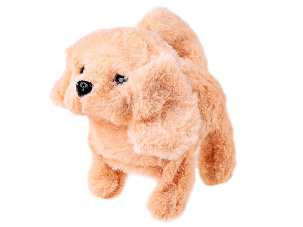 - câine de pluș de culoare bej cu blană moale, ochi și nas negri
