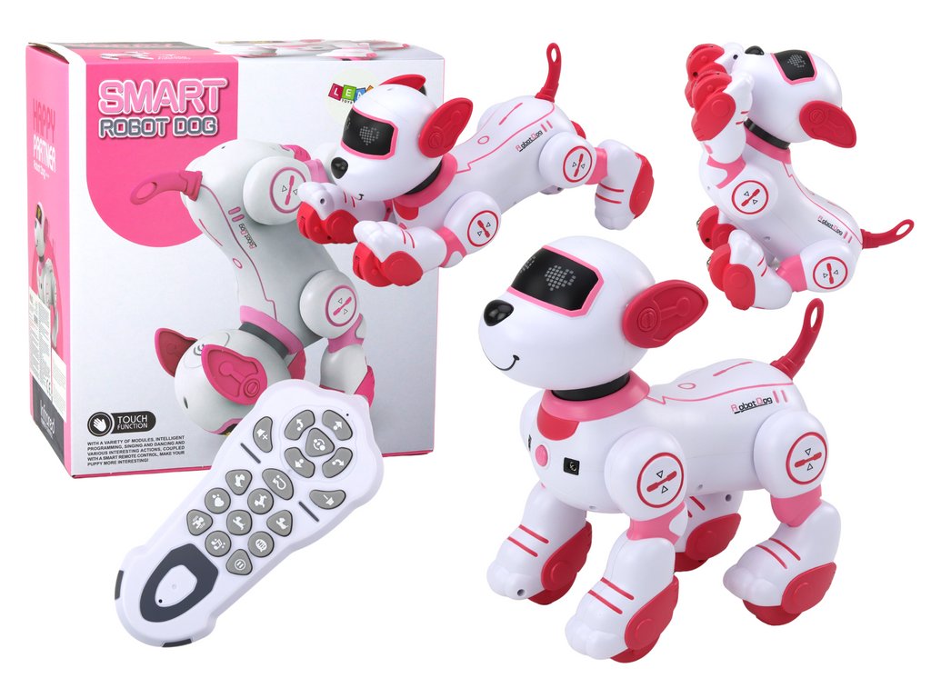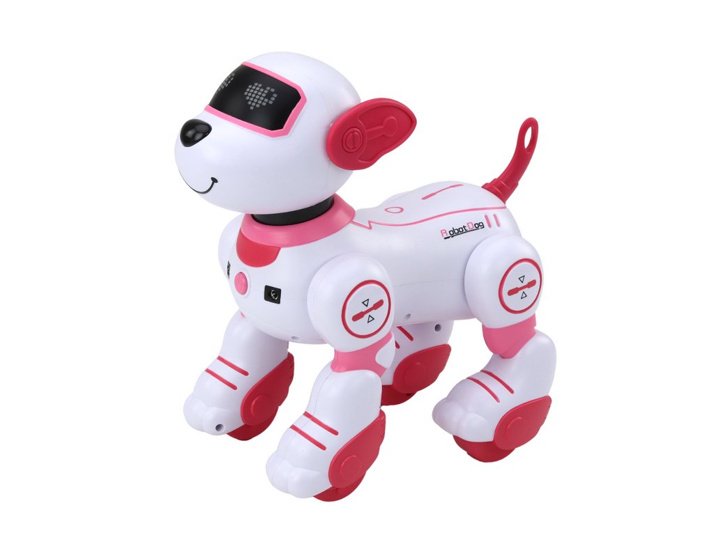 Câinele robot interactiv, controlat de la distanță, dansează și urmează comenzile roz