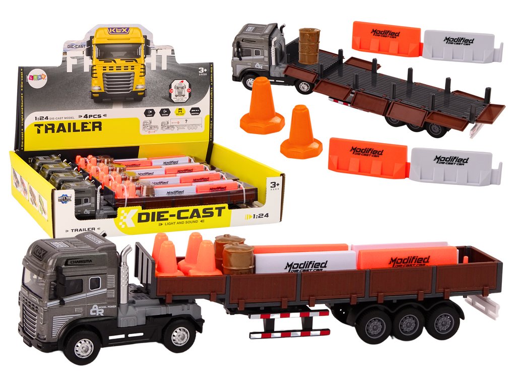 Camionul cu remorcă este un model la scară 1:24 care imită fidel vehiculul real. Are o serie de caracteristici care cresc realismul jocului și valoarea educațională a acestui model. Modelul reprezintă un vehicul real la scară 1:24, ceea ce permite reprezentarea precisă a detaliilor și proporțiilor. Remorca are uși laterale care pot fi deschise, facilitând încărcarea și descărcarea. Este conceput pentru a fi transferabil pe diverse obiecte, sporindu-i versatilitatea și funcționalitatea. Pe remorcă există două butoaie care pot fi folosite ca marfă pentru a simula transportul materialelor. Modelul conține opt conuri care pot fi folosite pentru a crea scenarii pe șantier sau în alte situații. Pachetul include și patru bariere rutiere de culoare alb-portocaliu, care cresc posibilitățile de joacă și îi învață pe copii reguli de siguranță în trafic. Camionul are o unitate care permite modelului să se deplaseze independent.