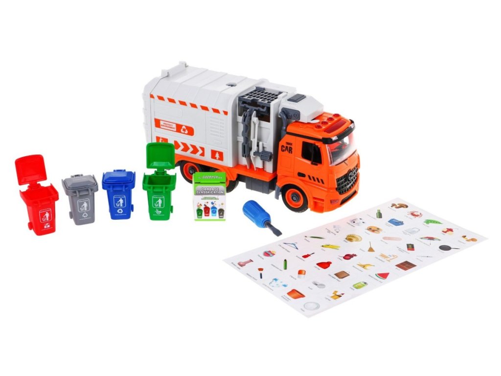 Setul de containere și camion de gunoi prezentat este un instrument de învățare prin joc. Cu siguranță va atrage orice mic bricolacer. Camionul de gunoi poate fi dezasamblat folosind șurubelnița inclusă și apoi reasamblat. Camionul de gunoi are efecte de sunet și lumină. Pe partea laterală a vehiculului există o bară pentru atașarea și răsturnarea containerelor cu deșeuri sortate. Deșeurile sunt înlocuite cu cartonașe cu ilustrații ale diferitelor tipuri de deșeuri. Setul include și o carte cu imagini. Din instrucțiuni, copilul învață ce gunoi trebuie depozitat în ce coș. Verde - deșeuri de bucătărie, albastru - deșeuri reciclabile, gri - alte deșeuri și roșu - deșeuri periculoase.