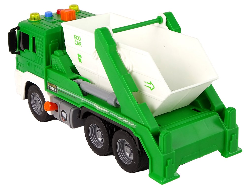 Camionul de gunoi a fost reprodus perfect, cu culoarea verde atrăgând atenția. Vehiculul are un sistem de antrenare prin frecare pe puntea spate , doar împingeți partea din spate, lăsați-l și bucurați-vă de viteză. Containerul cu deschidere vă permite să aruncați gunoiul într-un loc convenabil. Pentru a goli conținutul cu pompa, puteți ridica întregul recipient înapoi.