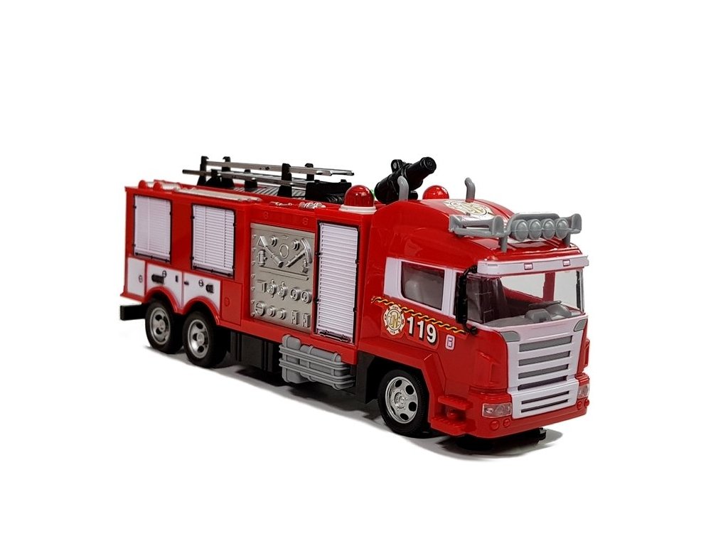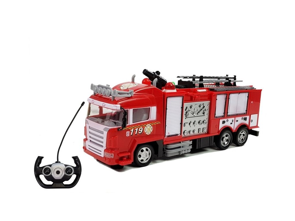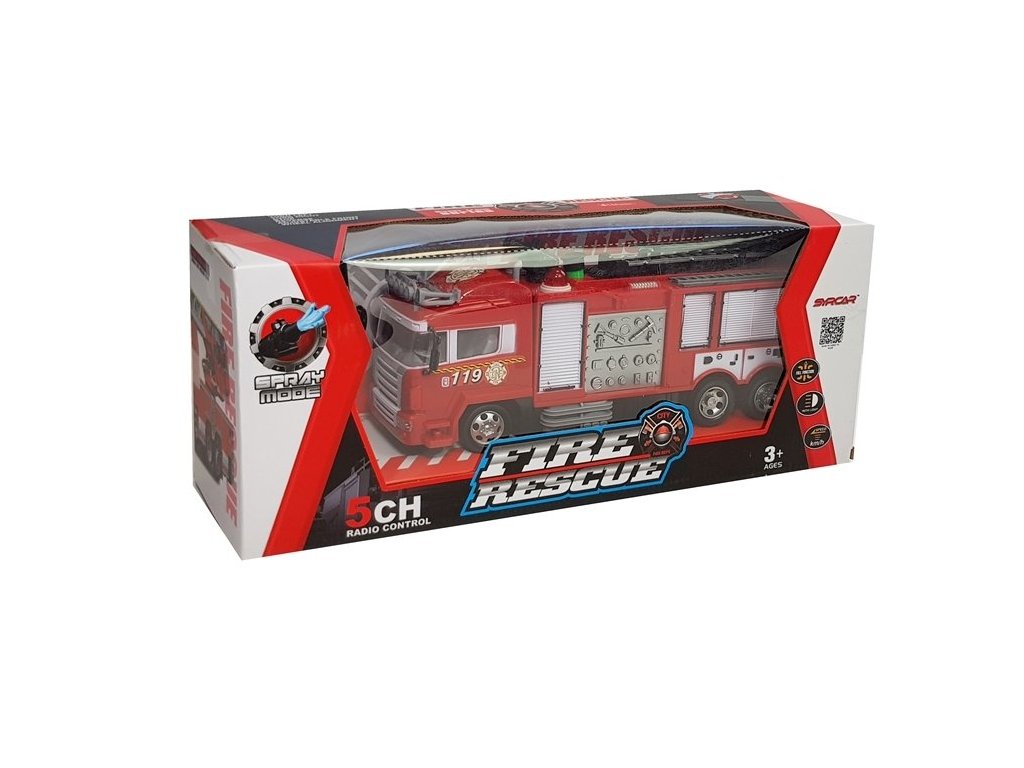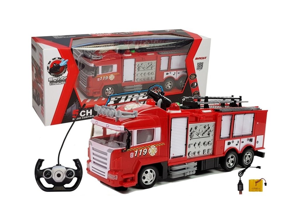 Mașina de pompieri mare este montată pe roți reșapate din cauciuc. Se descurcă cu ușurință pe terenuri denivelate. Capacitatea de a controla vehiculul cu o telecomandă vă permite să conduceți înainte/înapoi și dreapta/stânga. O altă atracție este pulverizarea cu apă, doar adăugați apă folosind pâlnia și începe distracția.