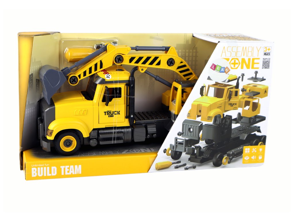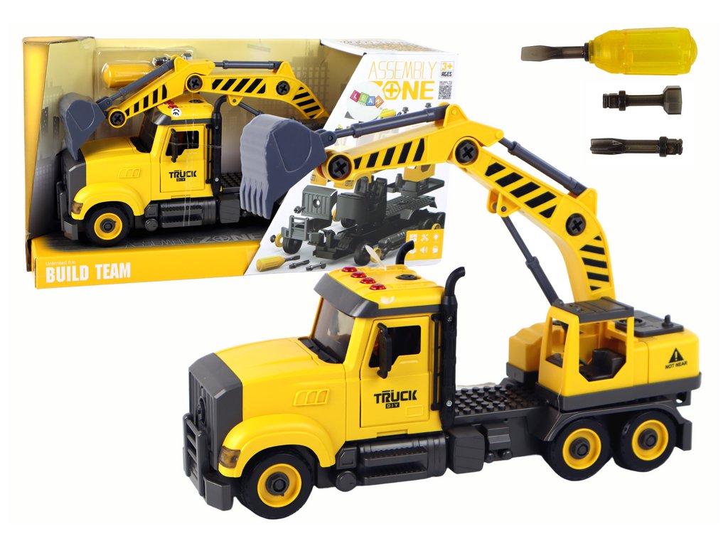 Veți găsi 4 butoane care activează 4 sunete diferite și adaugă autenticitate distracției. Acționarea prin frecare asigură deplasarea simplă și dinamică a căruciorului. Setul include și o șurubelniță cu 2 vârfuri interschimbabile pentru joc interactiv și experimentare.