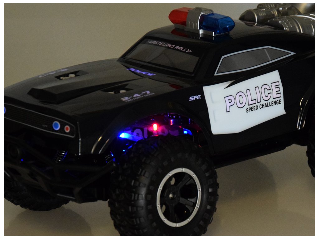 Mașina se caracterizează printr-o caroserie ușoară din plastic flexibil. Roțile mari, din cauciuc, cu arcuri garantează aderența la suprafață, ceea ce permite mașinii să circule eficient prin viraje. Mașina are un vârf reglabil. Poate cea mai mare atracție este luminile roș-albastre, intermitente, care imită semnalele de alarmă ale poliției. Sunt aprinse inscripțiile POLICE și numărul de pe plafonul vehiculului. Efectul este cel mai bun în întuneric.