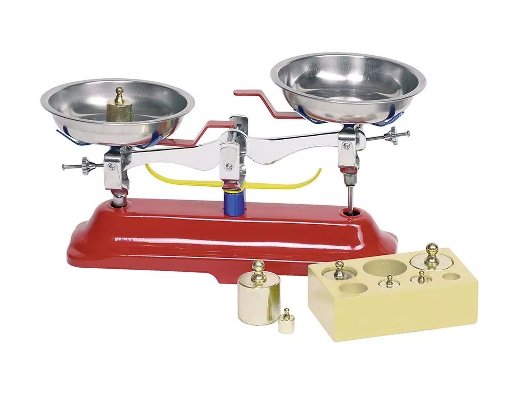 Cântarul robust din metal cu șapte greutăți este un instrument stabil pentru jocurile copiilor și pentru a exersa estimarea greutății.