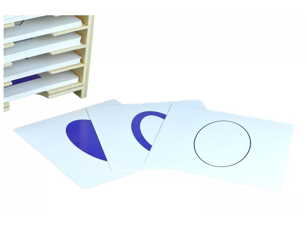 Set complet de carduri ca instrument senzorial Montessori suplimentar, conceput pentru a lucra cu comoda geometrică. Cardurile corespund formelor din comodă și sunt folosite pentru a exersa distincția vizuală și memoria formelor.