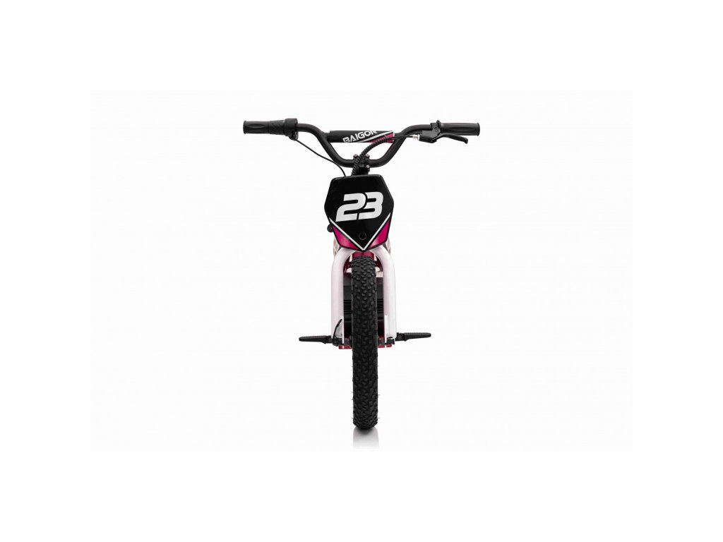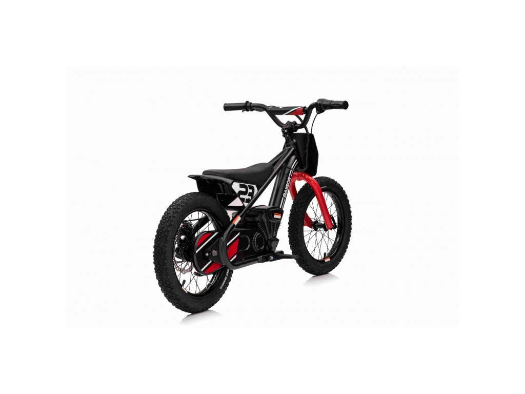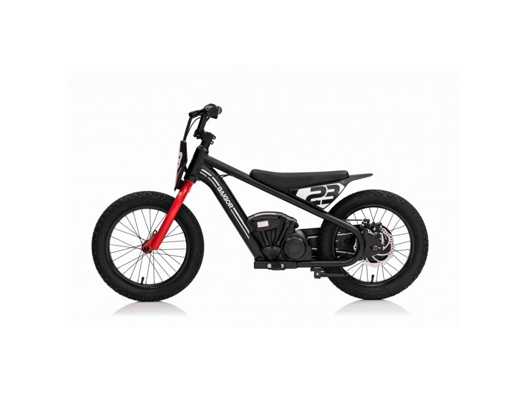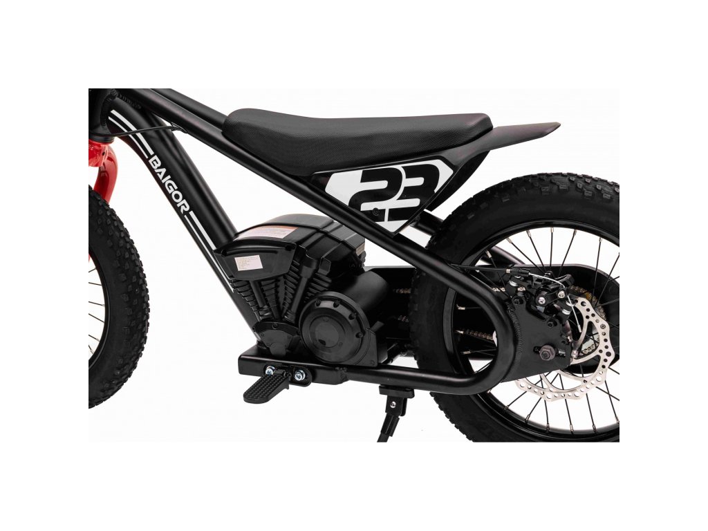 Motocicleta/bicicleta electrică pentru copii BAIGOR 23 PRO vine cu roți gonflabile , care sunt silențioase și nu interferează la conducere. Copilul stă într-un scaun confortabil din piele ecologică , capacitatea sa de încărcare este de 60 kg . BAIGOR 23 PRO are frână pe disc spate, transmisie cu lanț și atinge o viteză de până la 25 km/h . Pachetul include o baterie si un incarcator.