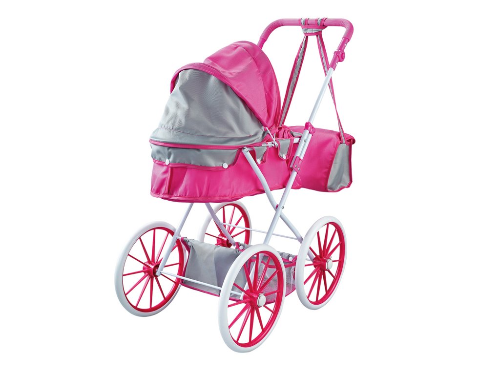 Carucior metalic pentru papusi cu geanta, roti mari, roz