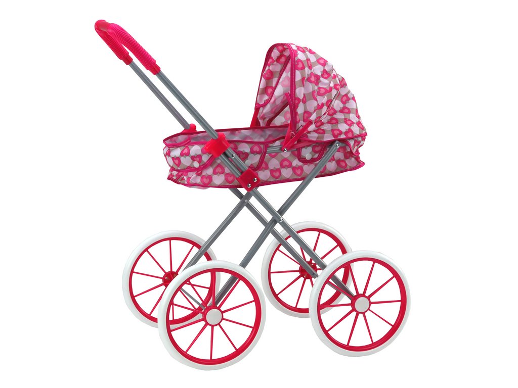 Cărucior pentru păpuși cu roți mari și baldachin pliabil - inimioare roz