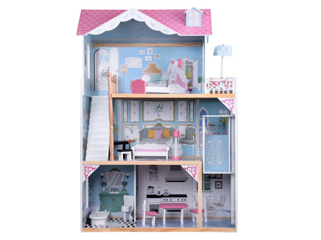 Casă mare de păpuși din lemn cu mobilier în culori pastelate