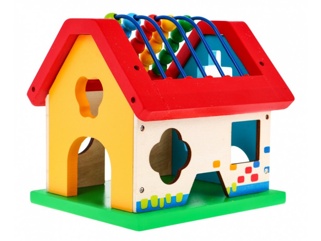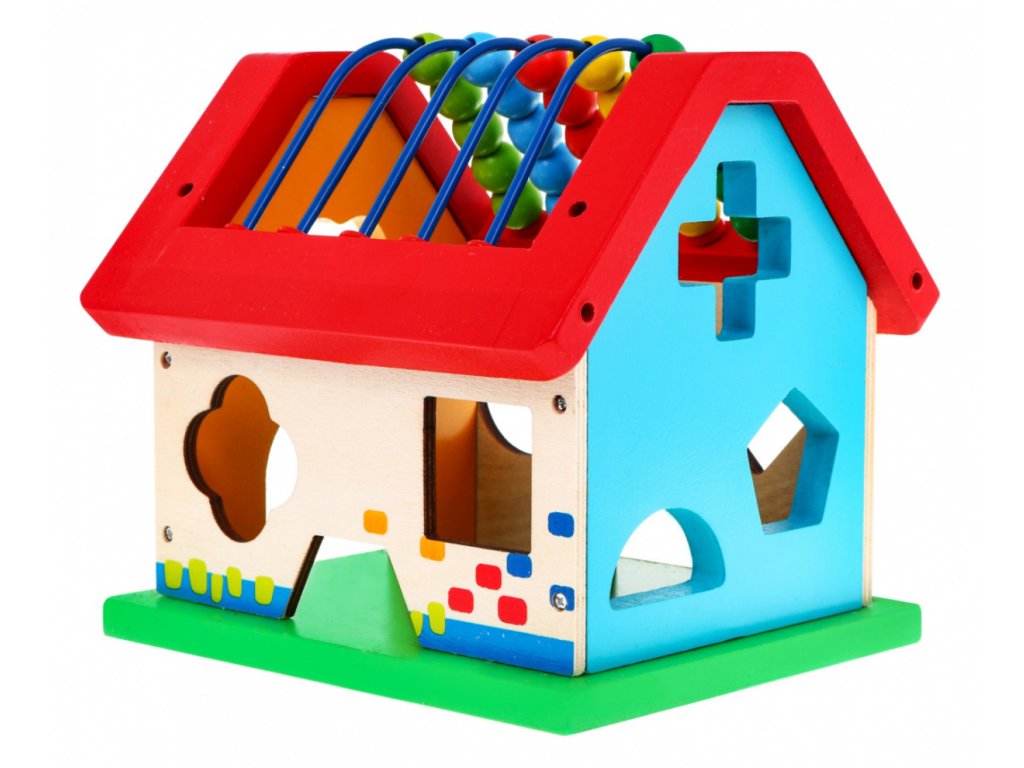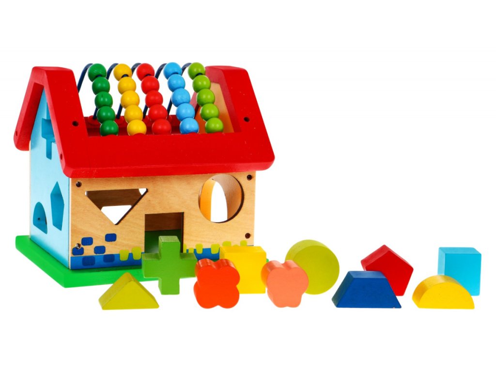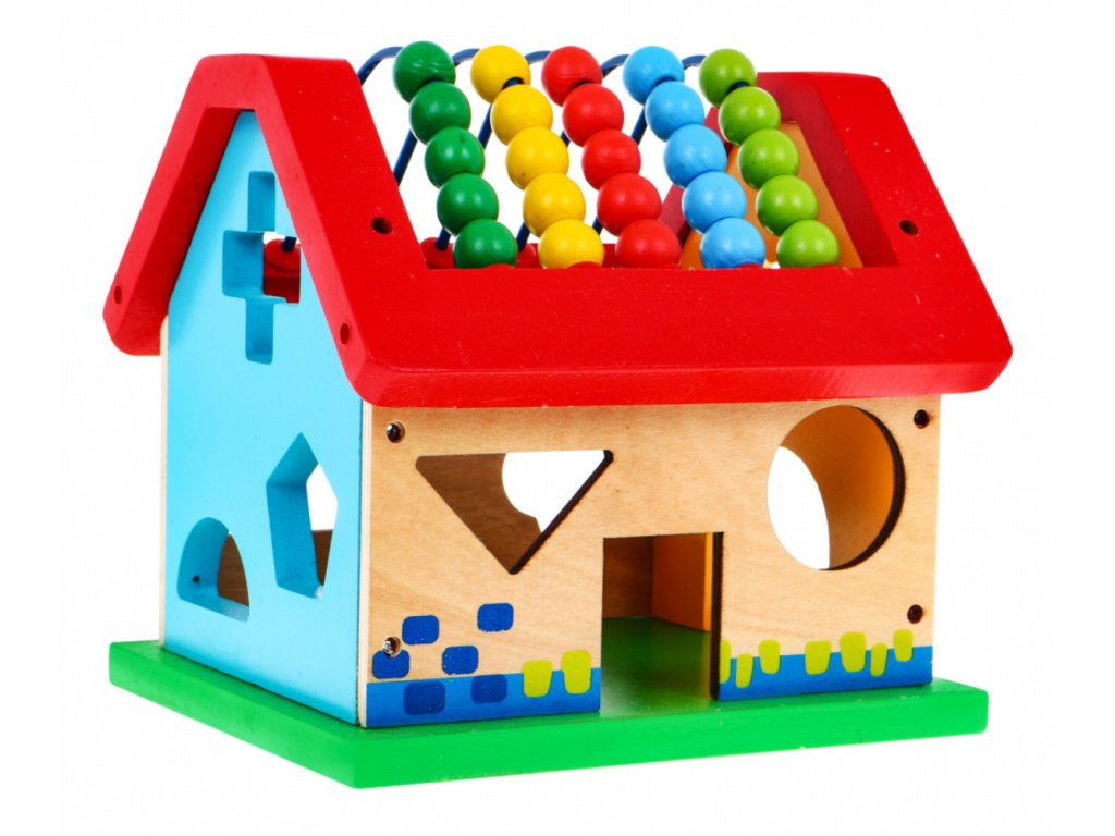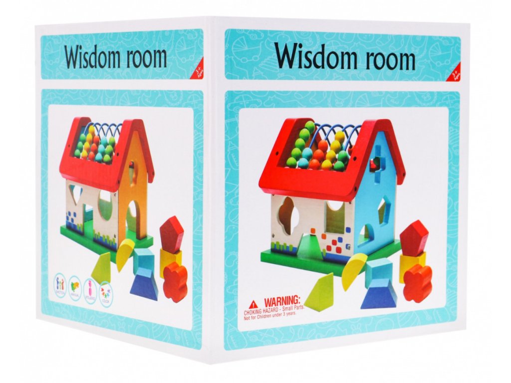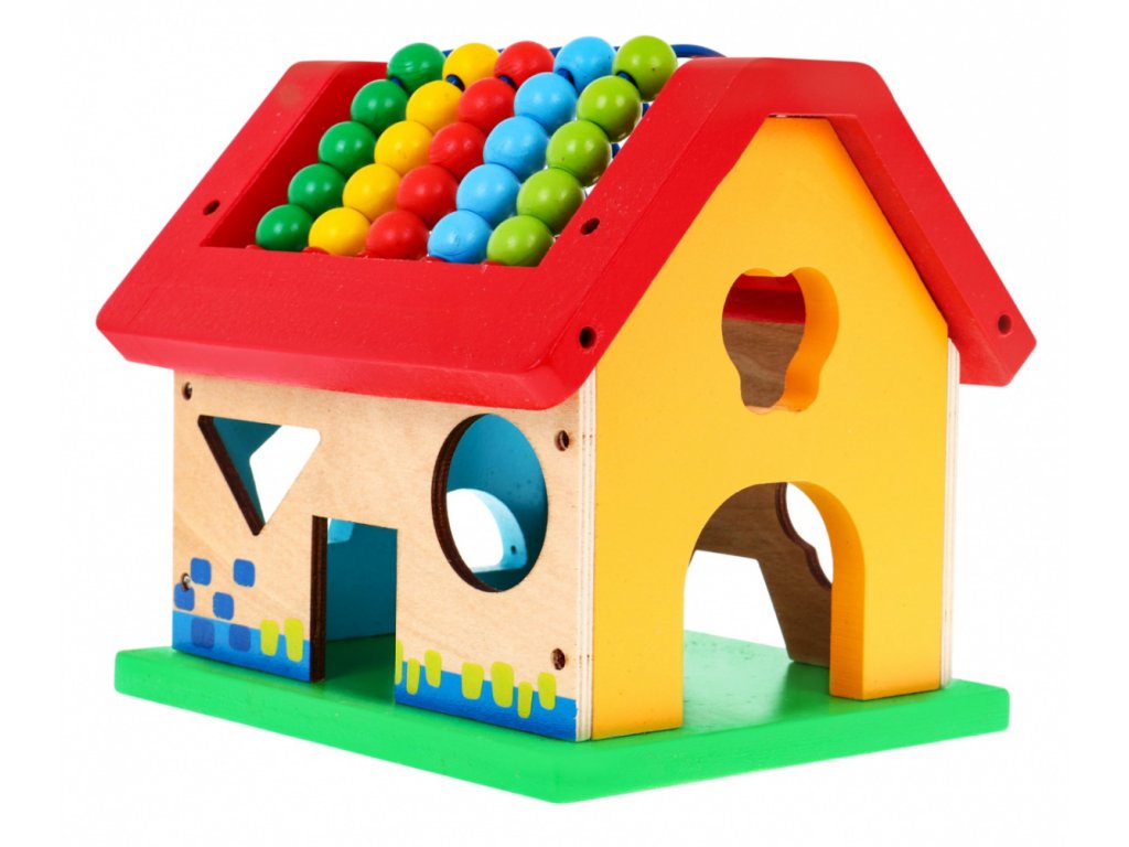 Casa de lemn este o jucarie dedicata copiilor de la 3 ani. Combină distracția și învățarea. Fiecare perete are găuri de diferite forme. Există un abac pe acoperișul casei pentru a vă ajuta să învățați să numărați. Joaca cu aceasta casa multifunctionala exerseaza acuratetea, rabdarea si dezvolta abilitatile manuale ale copilului.