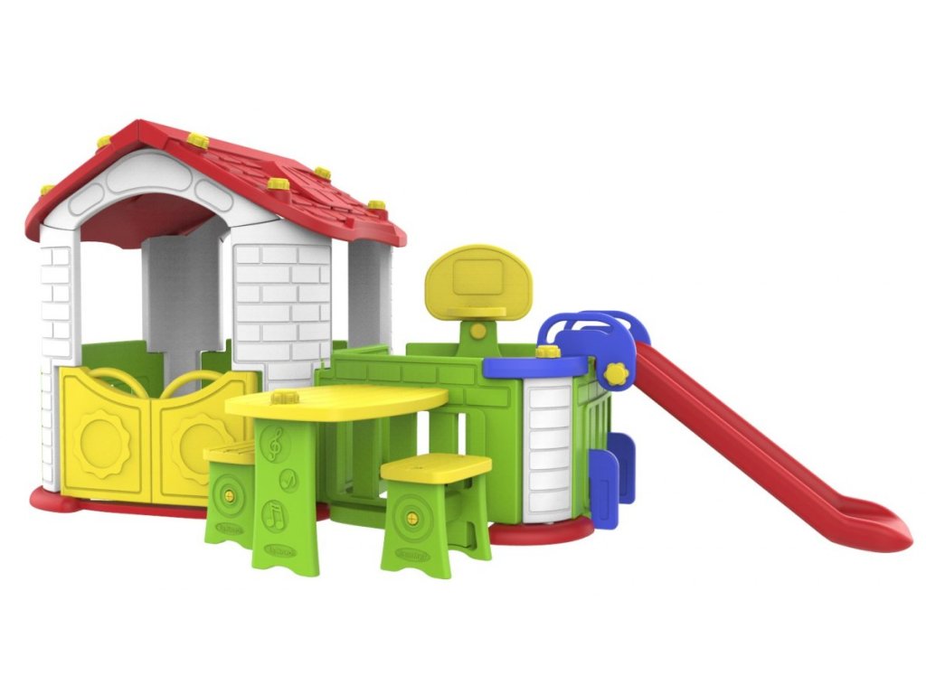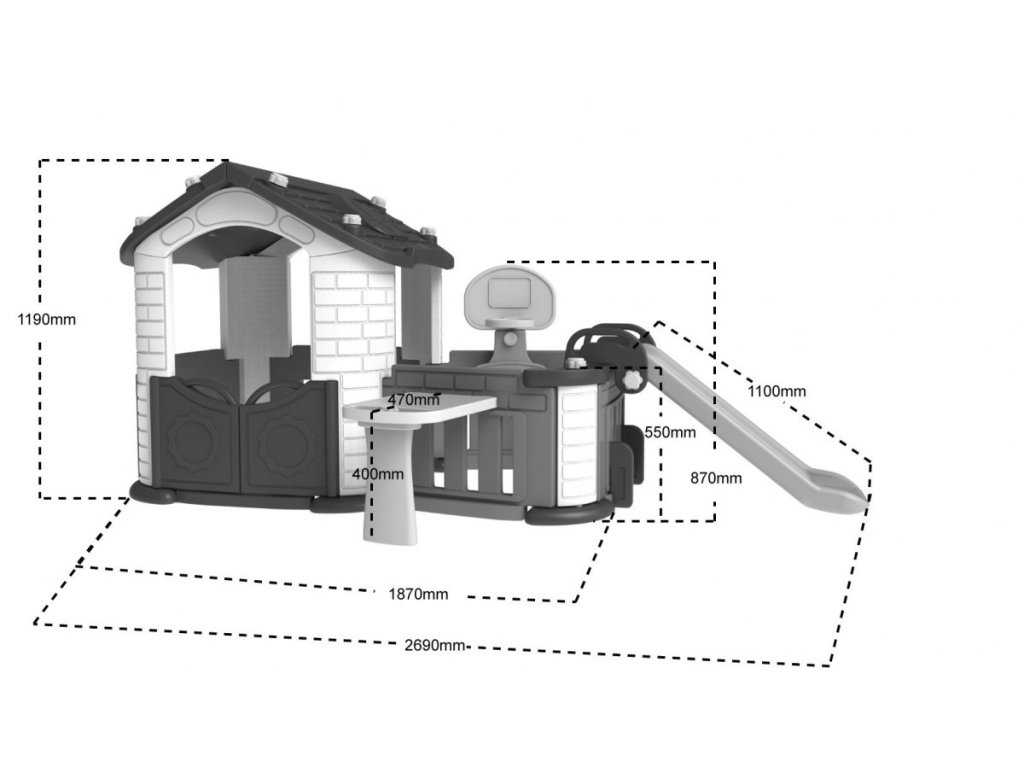 Casă de grădină 5 în 1 cu tobogan, coș de baschet și grădină cu masă. Toate elementele casei sunt realizate din material HDPE de înaltă calitate. Este polietilenă de înaltă densitate, de la 0,942 la 0,965 g/cm3. HDPE este un material mai flexibil și mai rezistent la deteriorări mecanice în comparație cu materialele folosite în alte construcții de acest tip. Toți pereții și componentele sunt realizate din plastic dublu strat. În plus, oferă opțiunea de umplere a pereților cu nisip sau agregat, ceea ce asigură stabilitatea structurii. Componentele mari facilitează asamblarea.