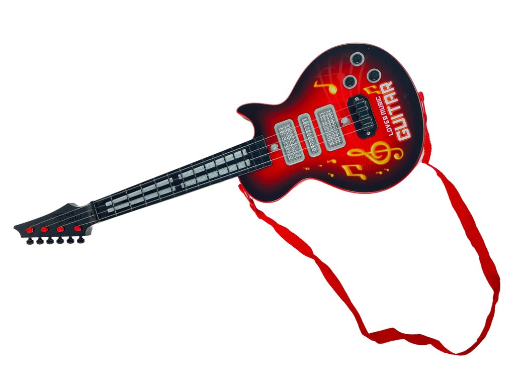 Un set grozav pentru micul artist și rocker. O chitară fantastică este o soluție excelentă pentru copiii cărora le place să cânte în fața unui public. Chitara are 2 butoane, fiecare dintre ele produce sunete, melodii sau tonuri diferite. Un alt plus este cureaua atașată, reglabilă , care îi ajută copilului să țină chitara mai ușor. Instrumentul are 4 coarde, iar sub ele sunt diode emițătoare de lumină , care formează un acompaniament ușor al muzicii.