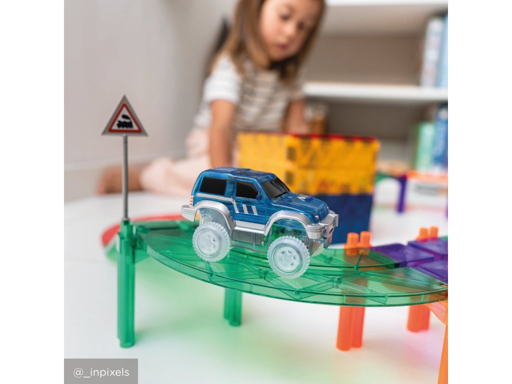 Extindeți-vă circuitul Cleverclixx cu o altă opțiune de construcție cu acest set practic Curbe pentru circuit. Conține 15 piese magnetice special modelate în 3 culori diferite, care permit crearea de arce fluide și curbe variate. Datorită acestui lucru, puteți continua cu setul de bază de 65 de piese și puteți construi circuite mai lungi, mai elaborate și mai distractive.