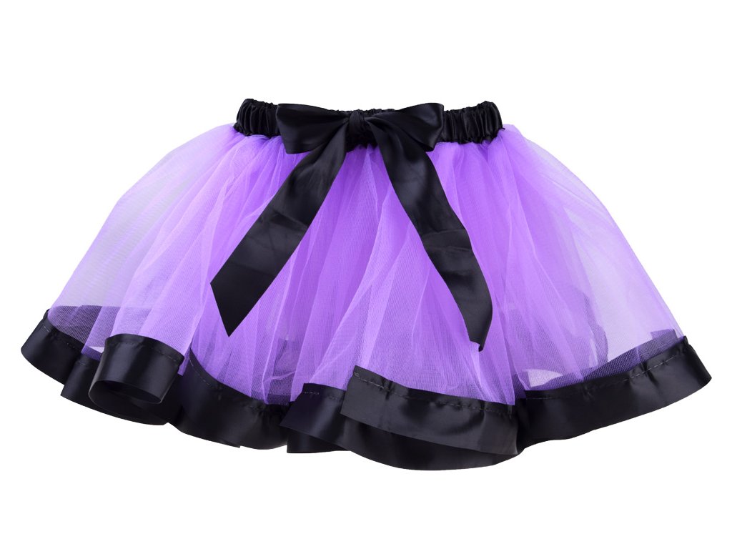 Setul este alcătuit dintr-o fustă mov cu volane împodobită cu ornamente din satin negru.