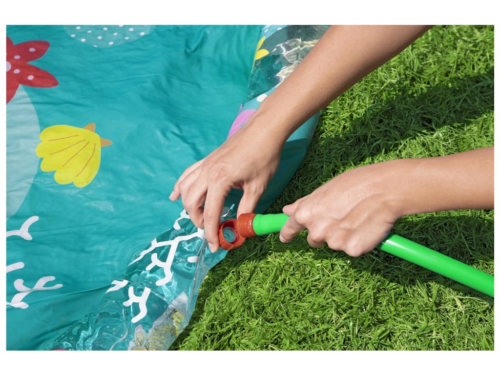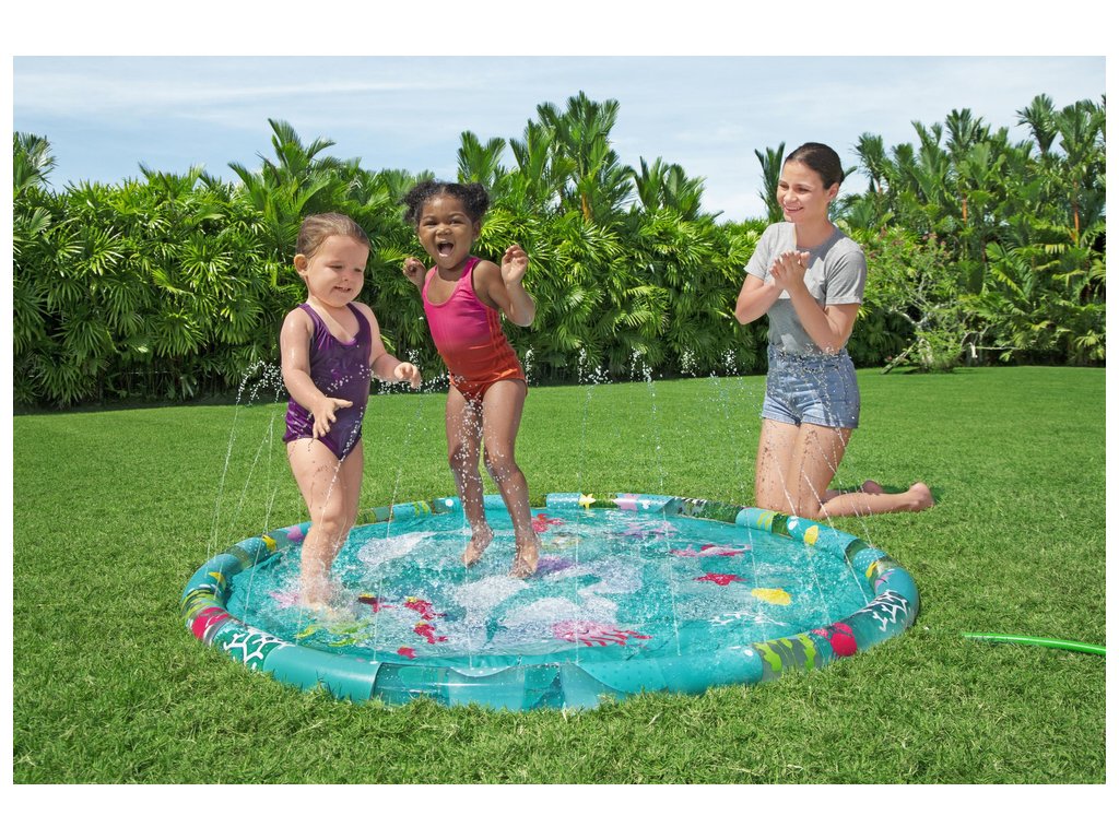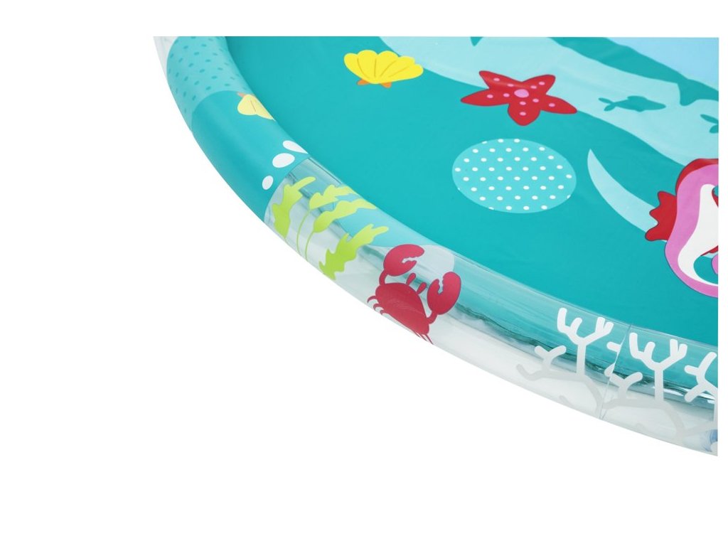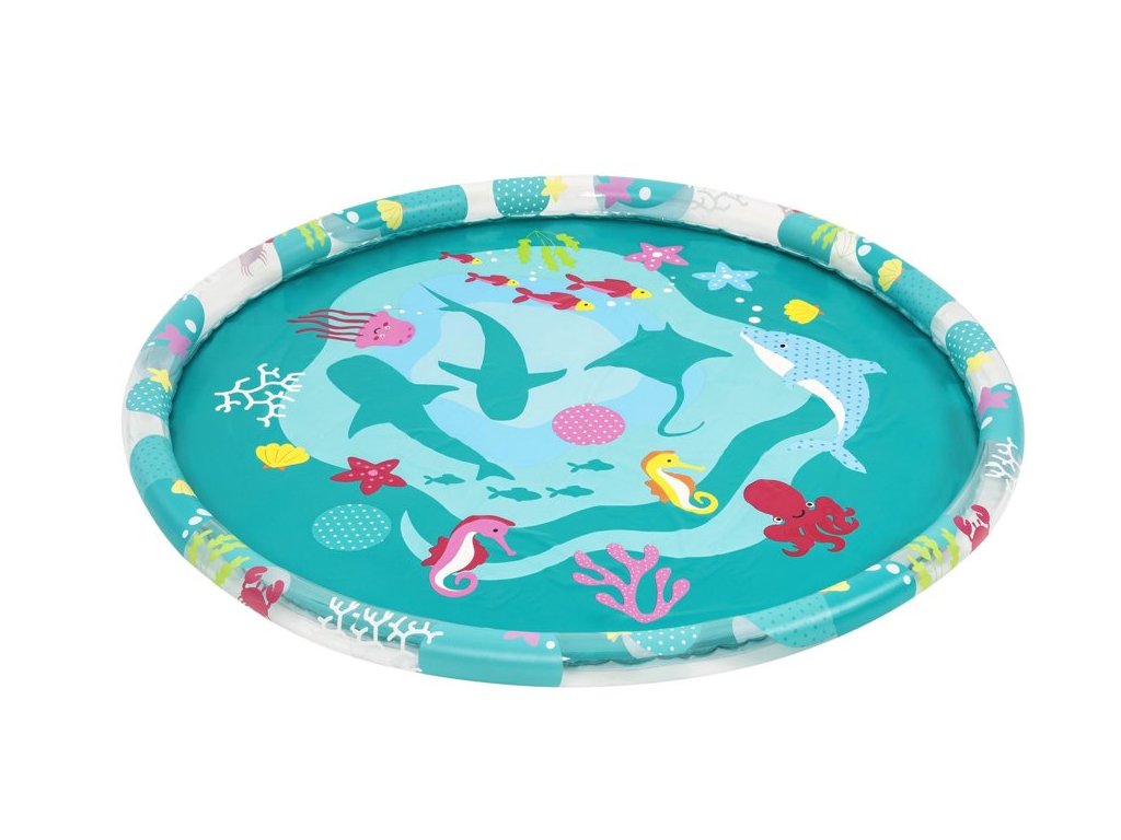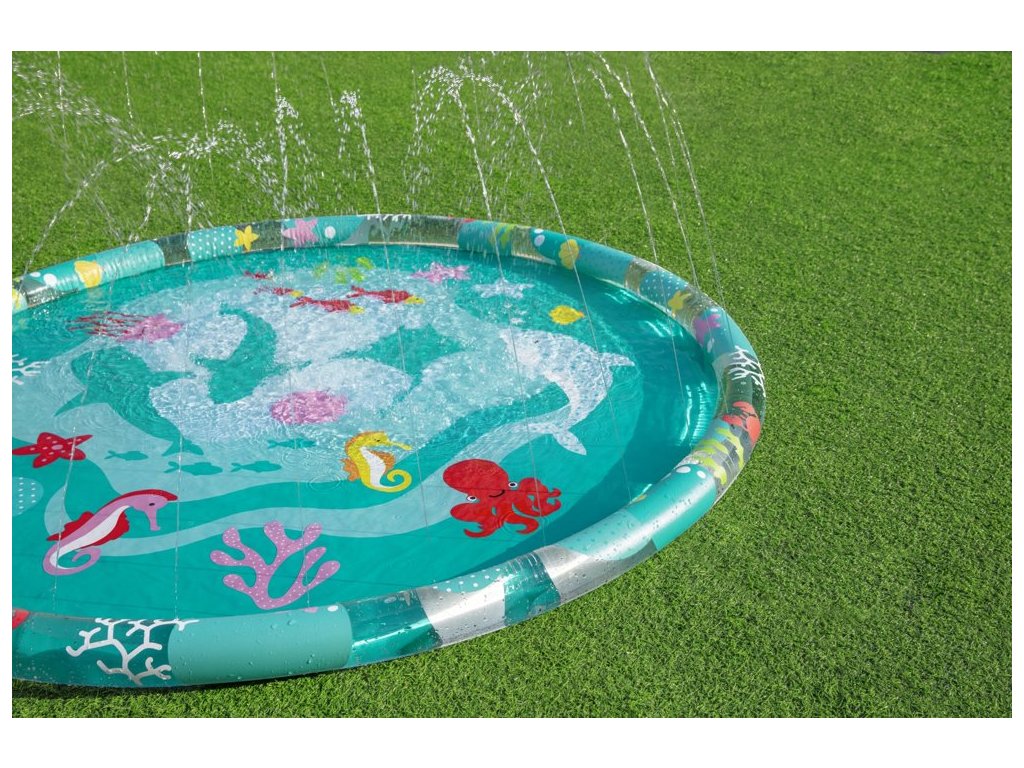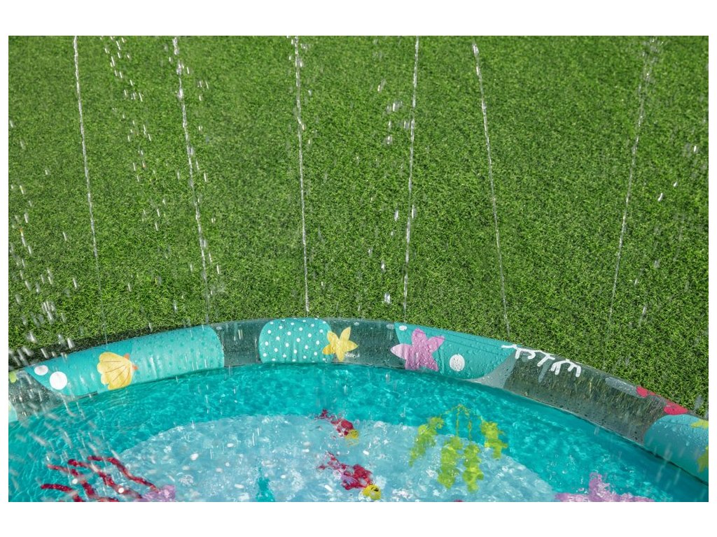 Piscina gonflabila cu fantana pentru copii are o dimensiune de 165 cm. Daca copilului tau ii place sa se joace in apa, va fi incantat si de saltea cu apa cu pulverizator. Covorașul este înconjurat de un cerc gonflabil, astfel încât apa este păstrată în interior. În plus, imprimeul atractiv care înfățișează viața mării îi va încuraja pe cei mai tineri să se joace împreună. O piscină cu fântână este foarte ușor și rapid de instalat, nu necesită prea mult spațiu pentru depozitarea în afara sezonului. Covorașul este destinat copiilor mai mari de 2 ani .