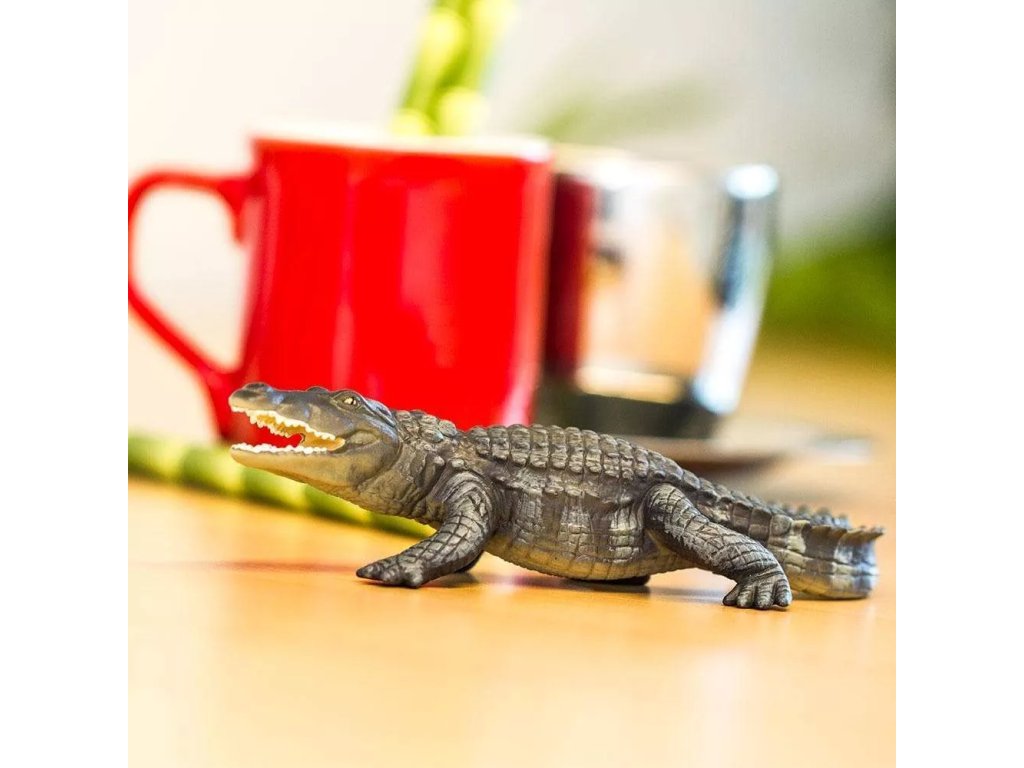 Crocodilii se găsesc în diferite regiuni ale lumii și pot trăi atât în apă dulce, cât și în apă sărată, în funcție de specie. Figurina este caracterizată de un bot mai îngust, în formă de V, diferit de cel al aligatorului. Datorită picturii și modelării manuale, fiecare piesă este unică și imită fidel trăsăturile reale ale animalului.