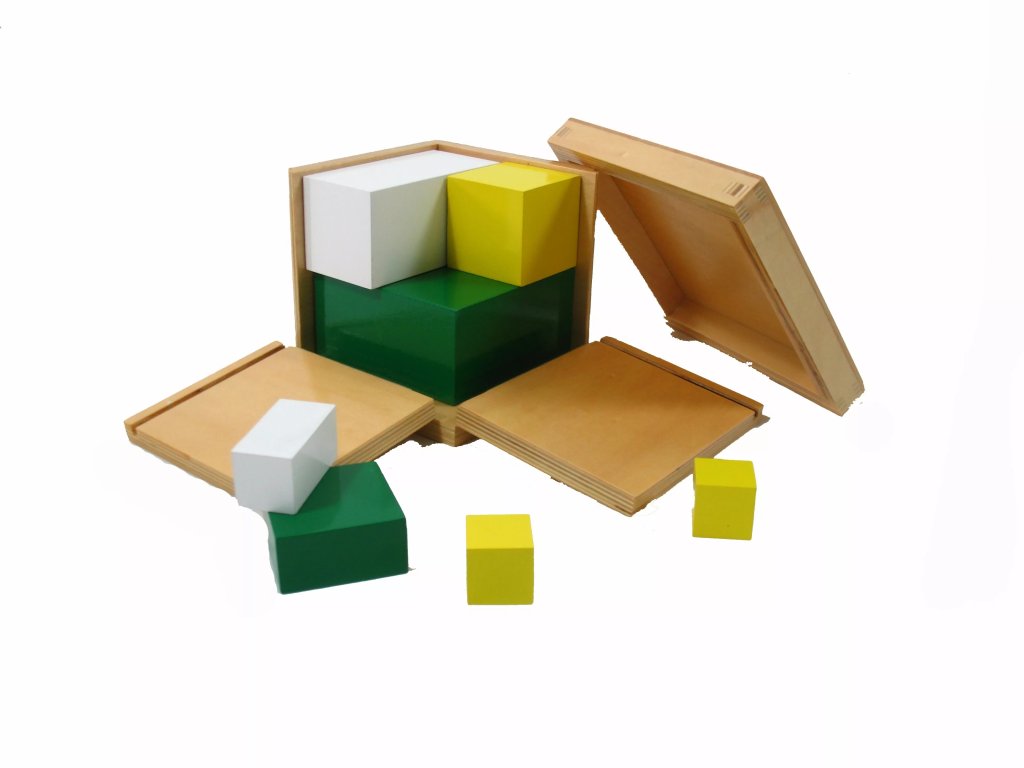 Setul include cuburi și prisme aranjate pentru a ilustra clar relația corespunzătoare pătratului unui număr. Cubul este depozitat într-o cutie de lemn.