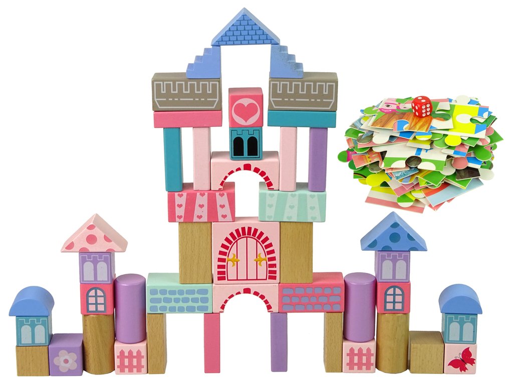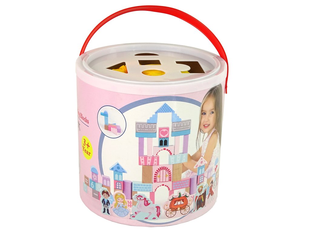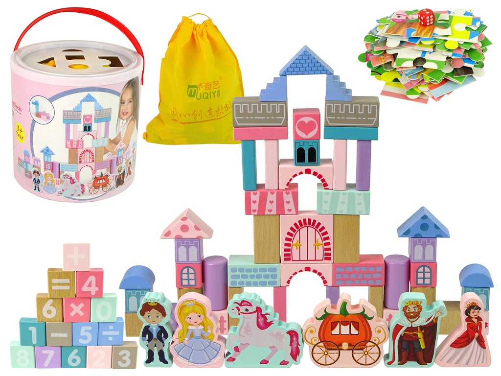 Un set de blocuri și puzzle-uri din lemn pentru copii este un cadou grozav pentru cei mai mici copii. Setul este format din 67 de piese cu tematică prințesă. Operatorii matematici și numerele se găsesc pe zaruri. Toate componentele setului sunt ambalate într-o găleată. Jucăria antrenează abilitățile motorii fine și imaginația copiilor.