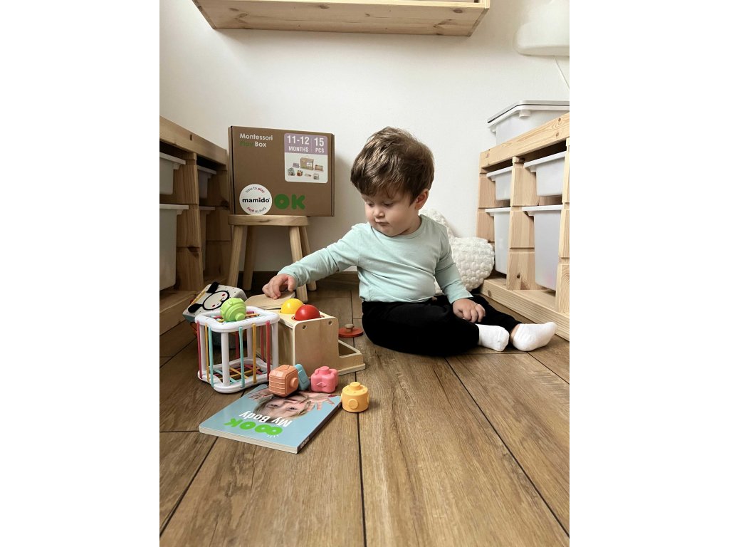 Vă prezentăm Cutia Educațională Montessori pentru copii de la 11 la 12 luni, concepută pentru a sprijini dezvoltarea senzorială, motrică și cognitivă a copilului dumneavoastră. Această cutie conține 15 jucării atent selectate care promovează coordonarea ochi-mână, abilitățile motorii fine și gândirea logică. Setul include blocuri interactive, jucării cu ciocan, cărți senzoriale și alte elemente. Toate jucăriile sunt fabricate din materiale de înaltă calitate, sigure și ecologice, blânde cu pielea copiilor.