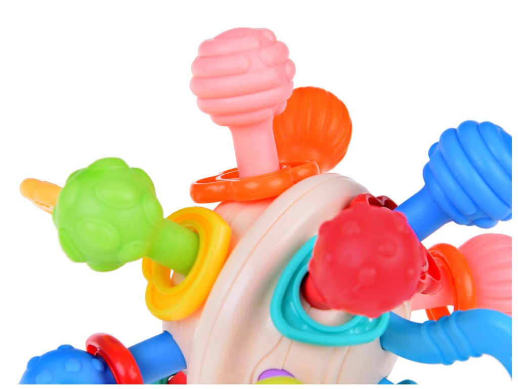 Stimularea simțurilor: Datorită varietății de structuri și proeminențe, dentierul nostru stimulează simțurile bebelușului, încurajându-l să descopere și să învețe noi senzații tactile.