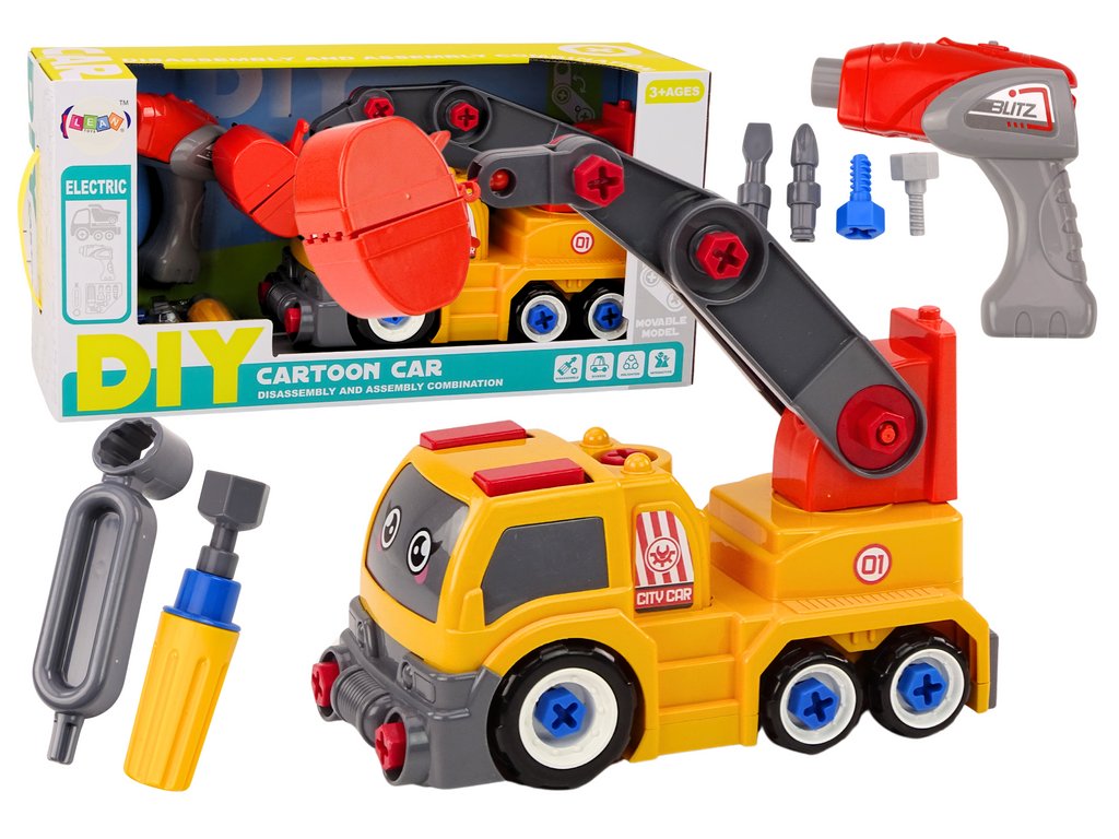 Setul de instrumente inclus, cum ar fi un burghiu, șurubelniță, cheie și trei capace de capăt interschimbabile sunt parte integrantă a acestei jucării, permițând copiilor să demonteze și să remonteze în mod independent vehiculul. Datorită acestui lucru, copiii nu numai că se distrează, ci și învață cum funcționează camionul, dezvoltându-și în același timp abilitățile manuale, concentrarea și creativitatea.
