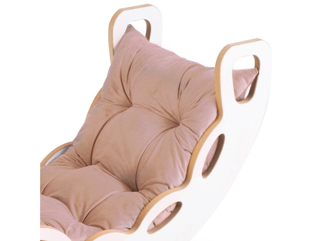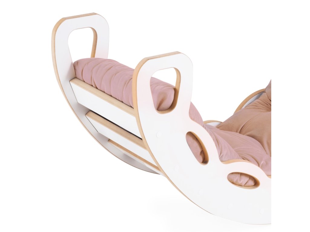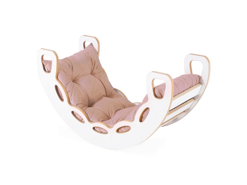 Balansoar din lemn Mini 4 în 1 cu perete de cățărare, tobogan și pernă (catifea bej/aurie), lemn alb
