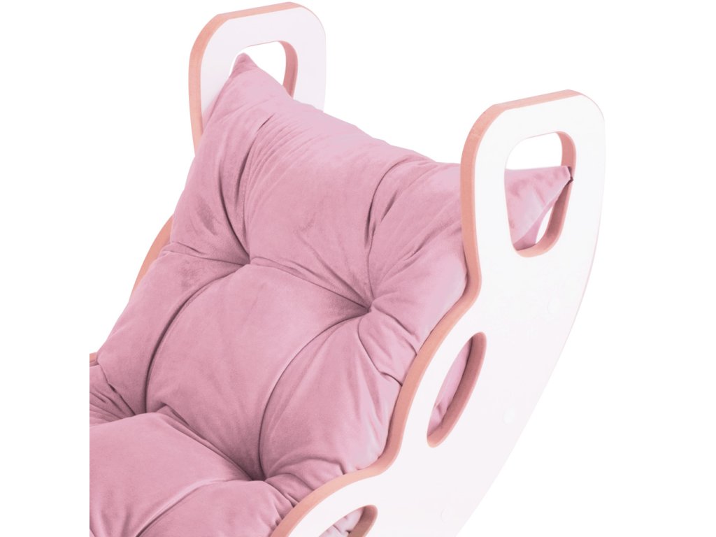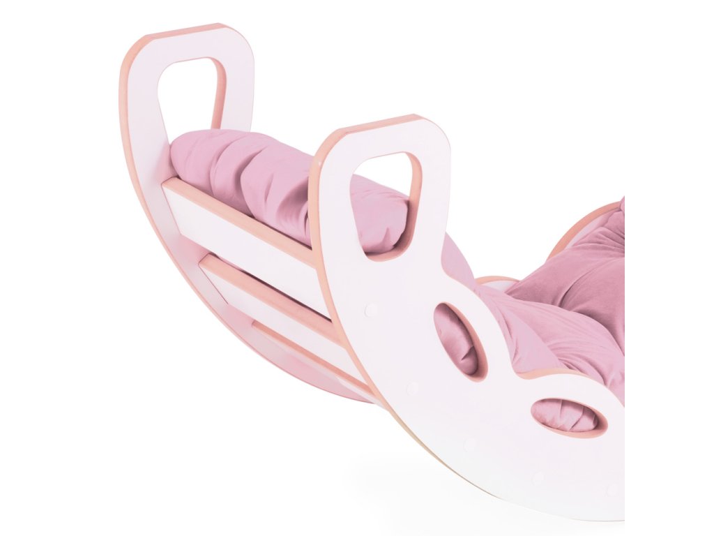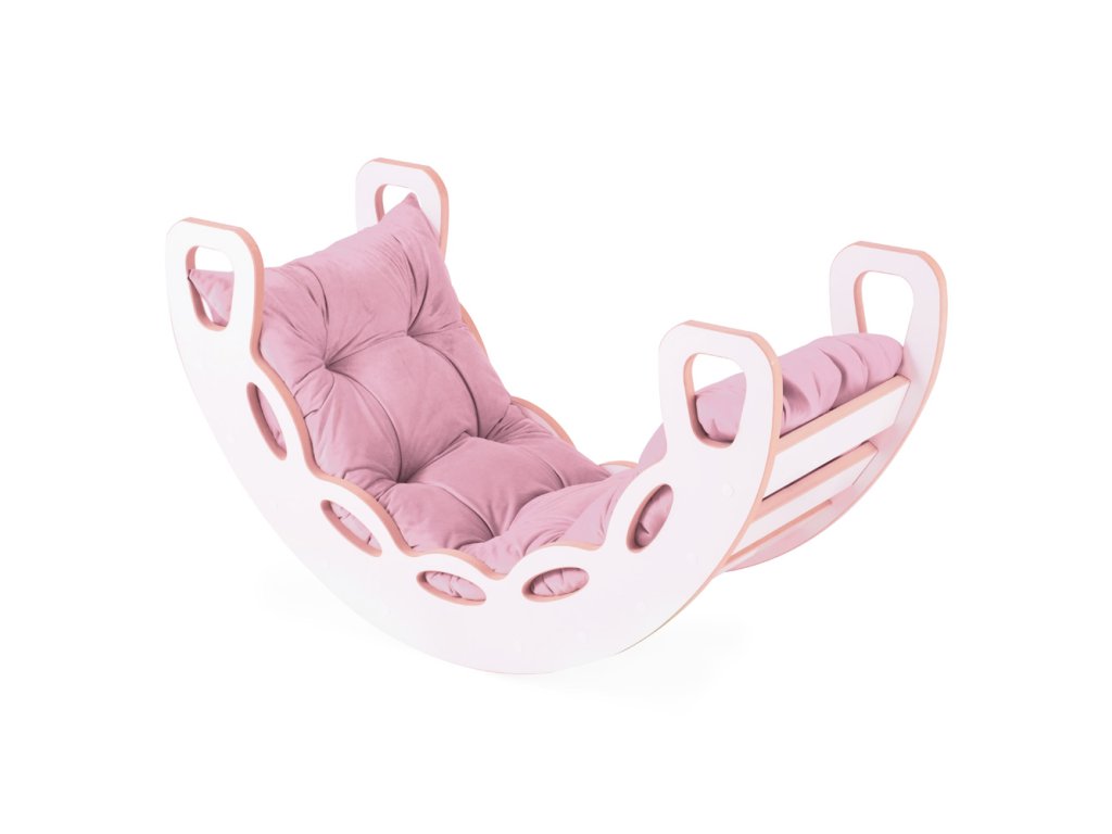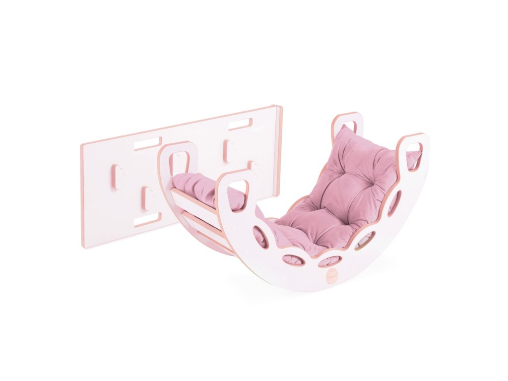 Balansoar din lemn Mini 4 în 1 cu tobogan, perete de cățărare și pernă (catifea roz, alb)
