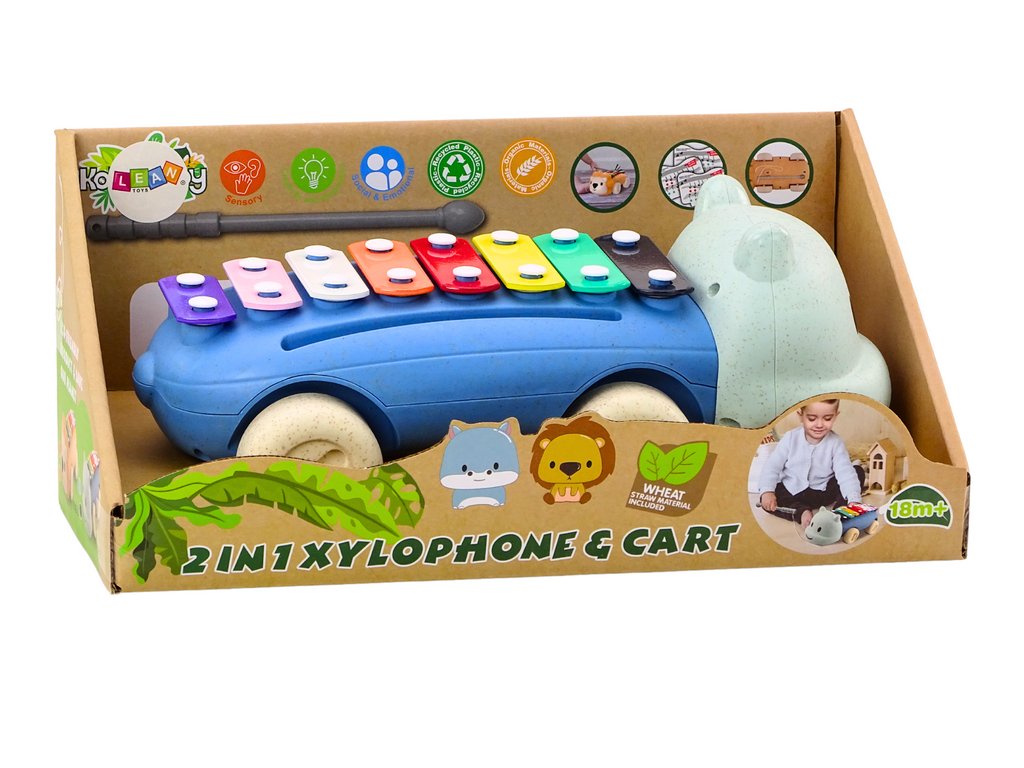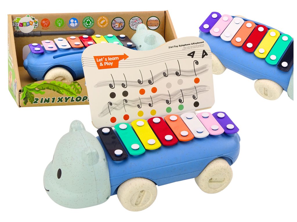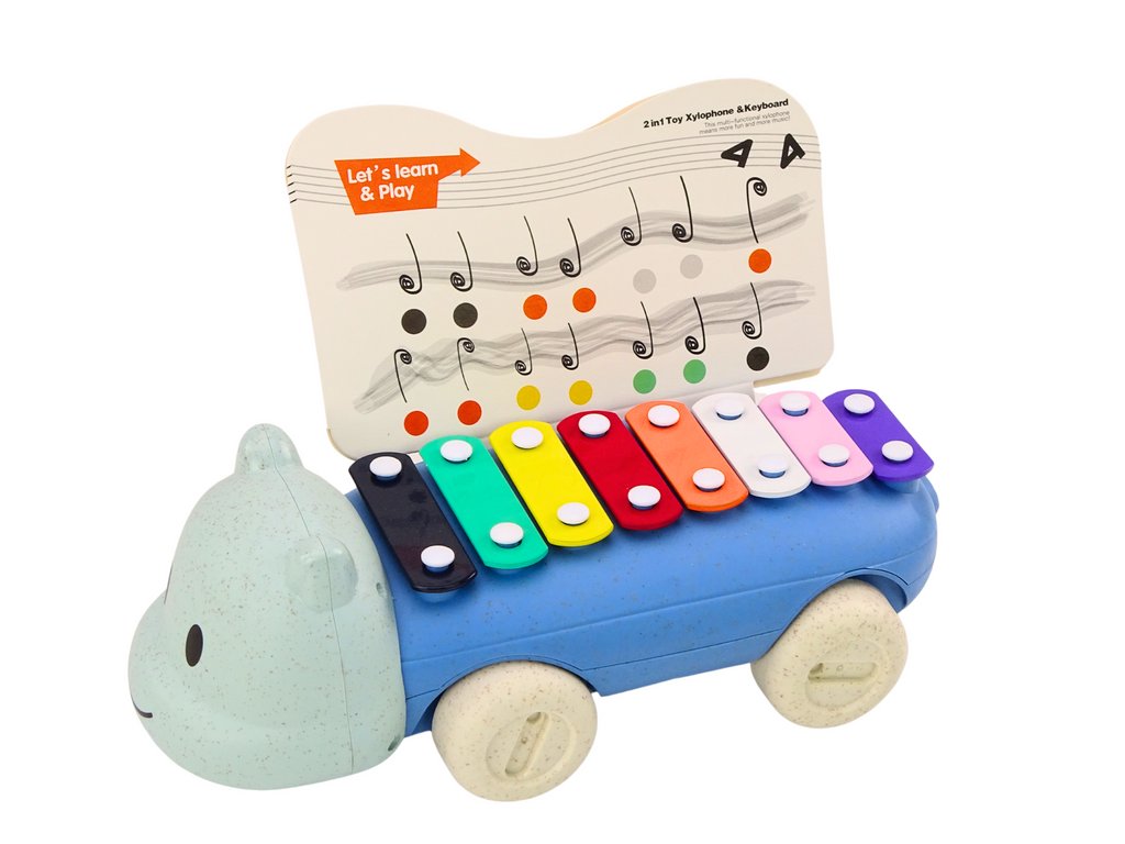Dulcimerul în formă de hipopotam are opt chei. Cu diferite culori și sunete, copiii pot învăța să distingă culorile și tonurile, ceea ce le susține dezvoltarea muzicală și cognitivă. Un ciocan este inclus sub dulcimer.