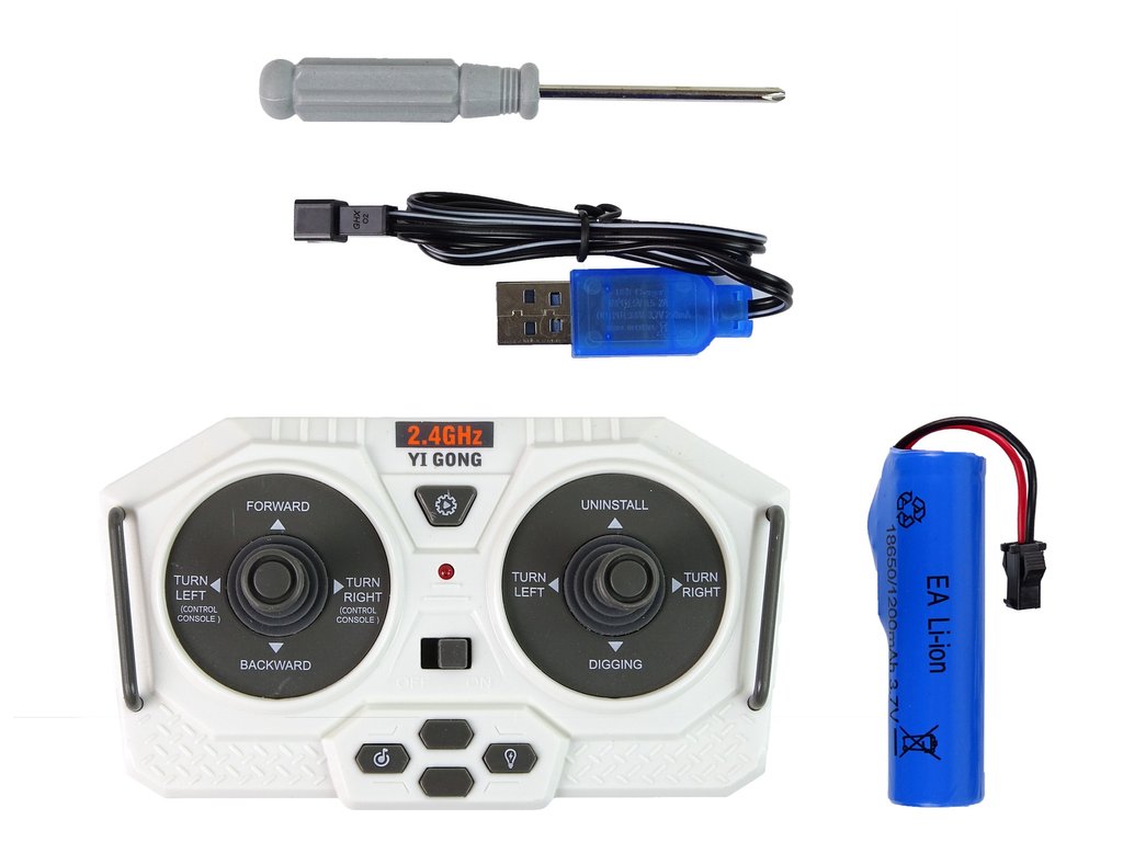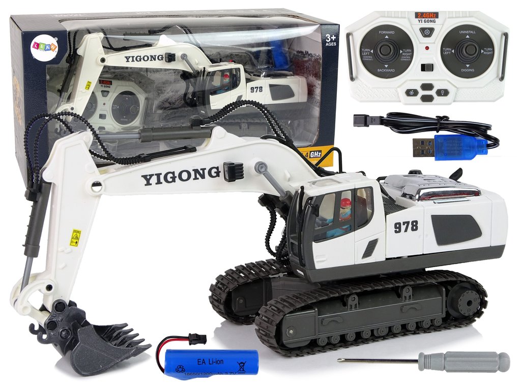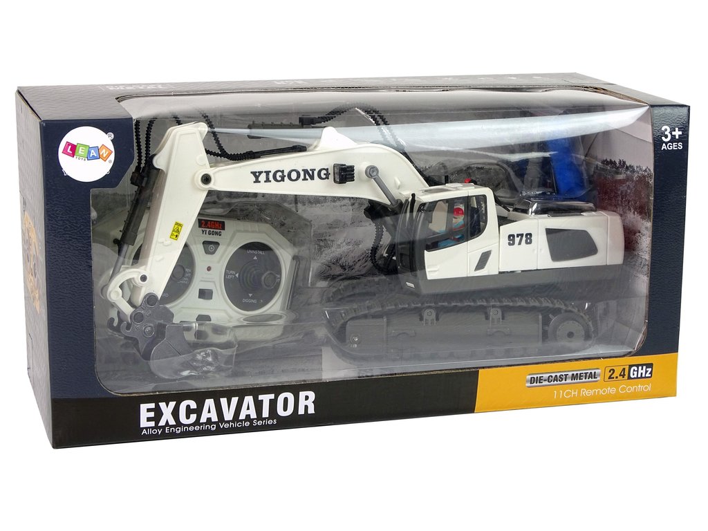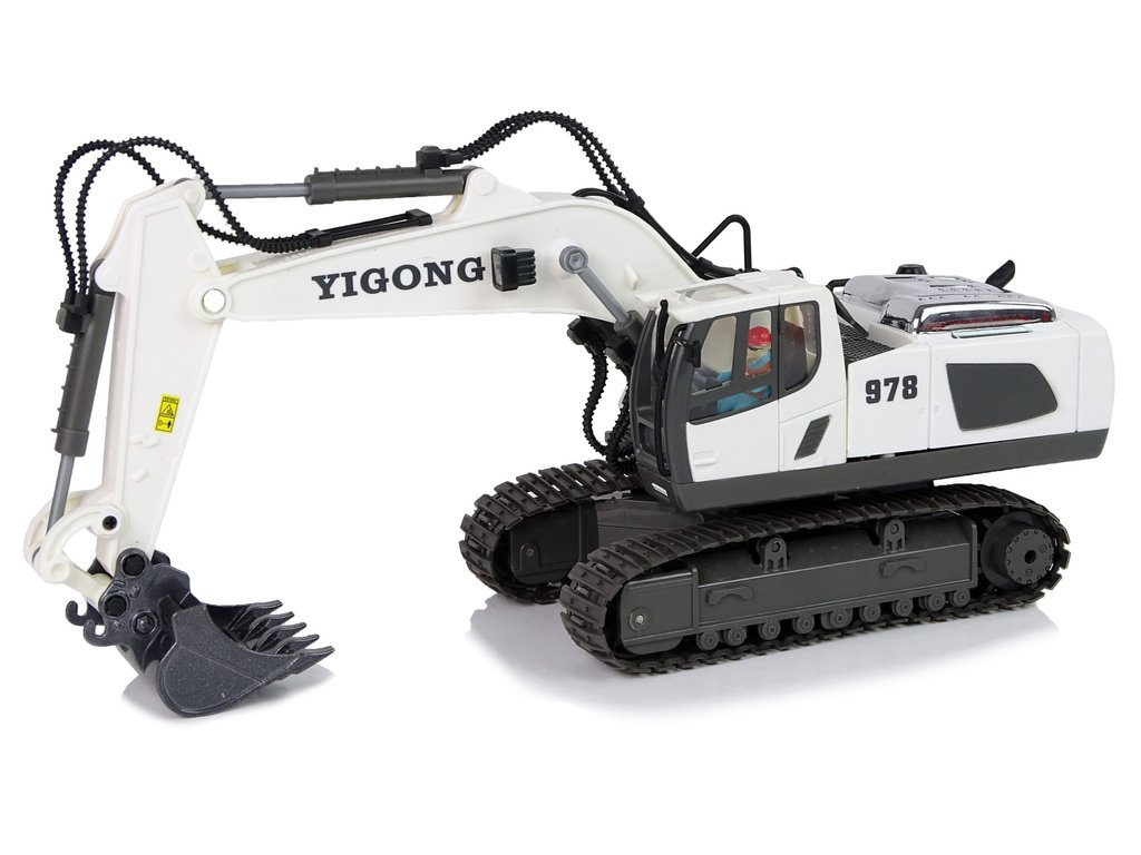 Camionul de construcție cu telecomandă este un model realizat în mod realist. Excavatorul alb este decorat cu detalii negre și autocolante tipice. Driverul are o frecvență de 2,4 Ghz. Manevrarea controlerului R/C este foarte ușoară, două joystick-uri permit o manevră confortabilă. Cu ajutorul acestuia, șoferul excavatorului poate conduce atât înainte/înapoi și dreapta/stânga, cât și poate regla volumul și, mai ales, poate mișca cupa. Pe partea laterală a lingurii este montată o lumină pentru a ilumina zona în timp ce aceasta se rotește.