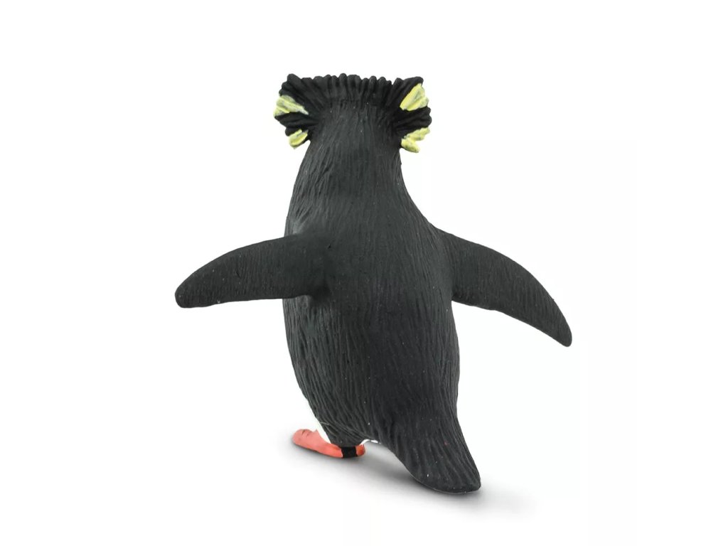 Figurină detaliată ce reprezintă un pinguin de stâncă, cunoscut pentru cuibăritul pe coaste stâncoase și penele ascuțite distincte de pe cap.
