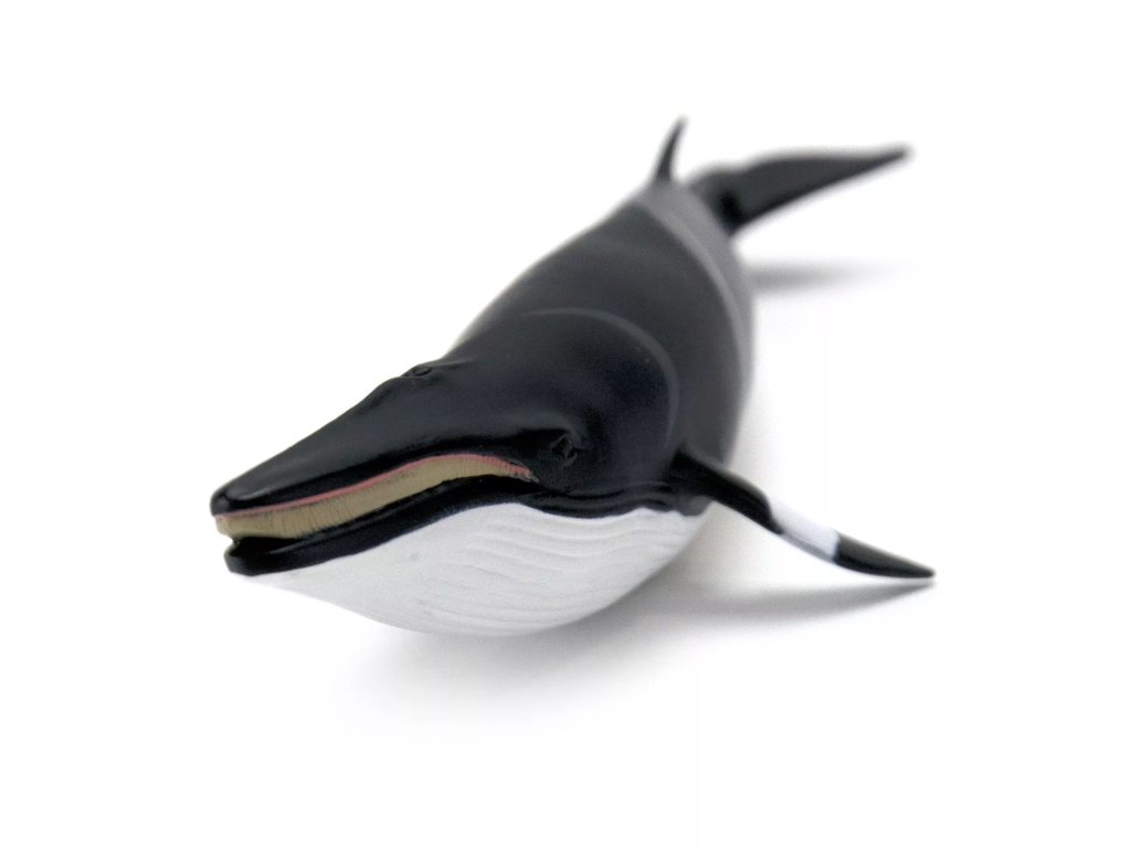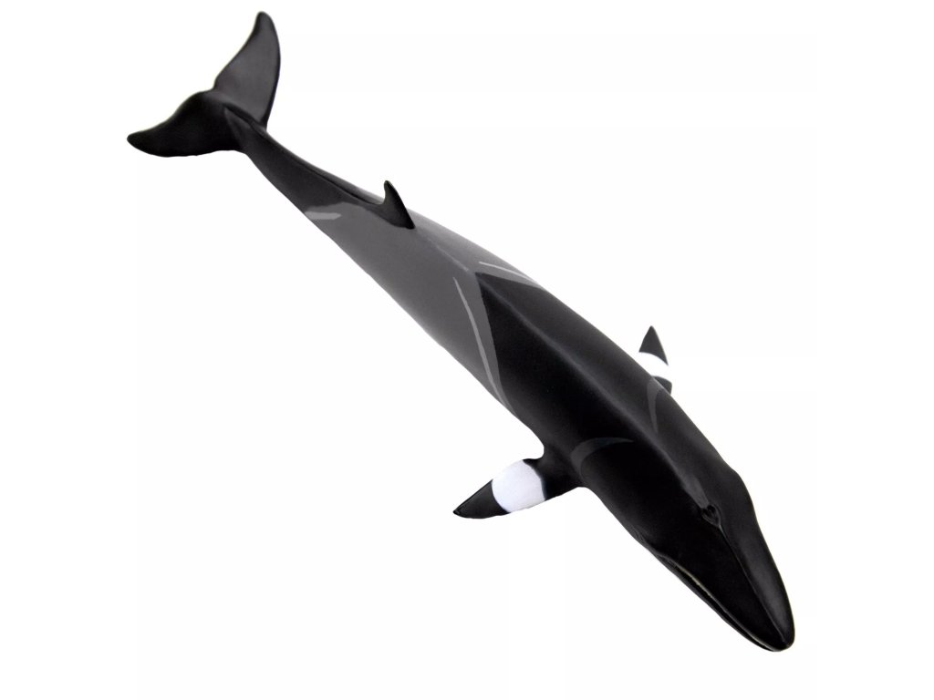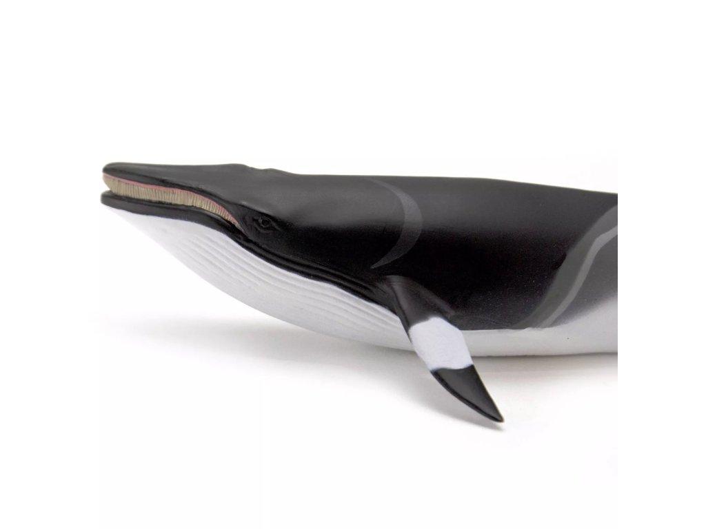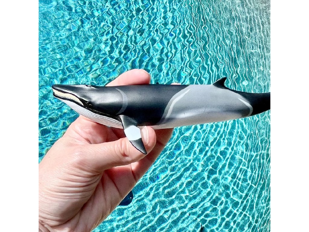 Figurină balenă Minke prelucrată în detaliu, care prezintă o balenă relativ mică, înrudită cu balena albastră. Potrivită ca model fidel pentru colecție, precum și ca ajutor pentru joacă și educație.
