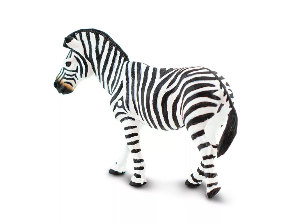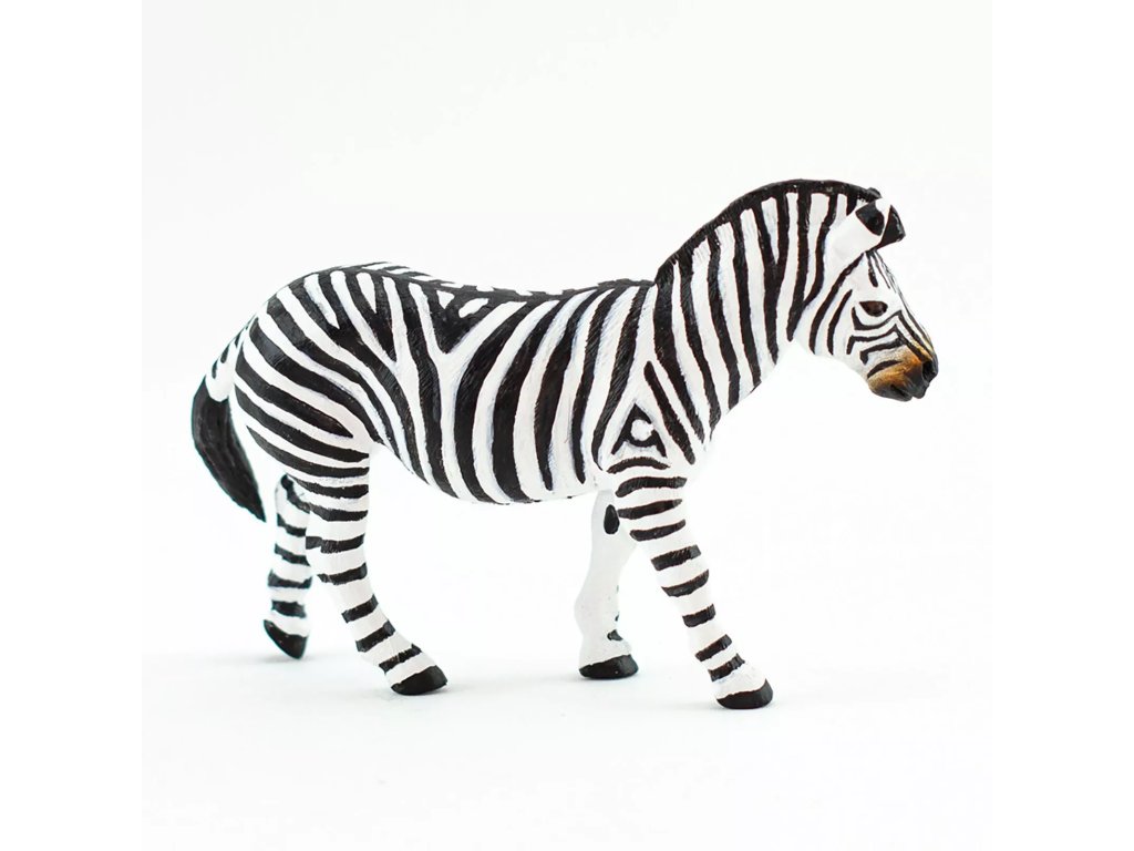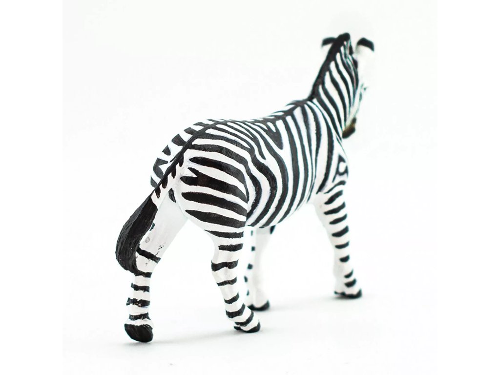 Figurina zebră de stepă, realizată în detaliu, reprezintă cea mai răspândită specie de zebră din Africa, adesea numită și zebră comună. Pe blană are un model caracteristic în dungi alb-negru, tipic pentru toate speciile de zebră.