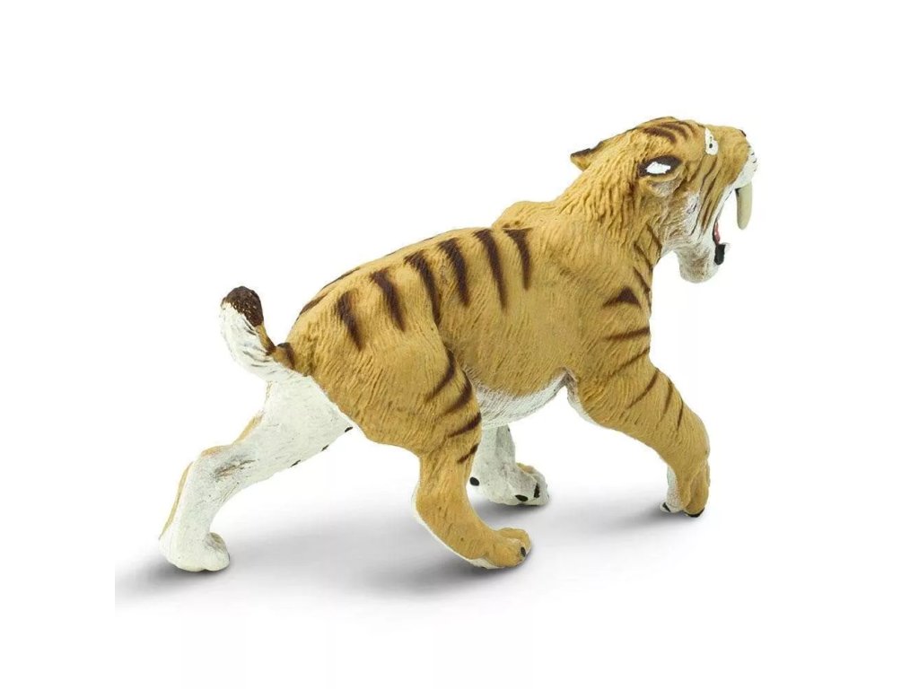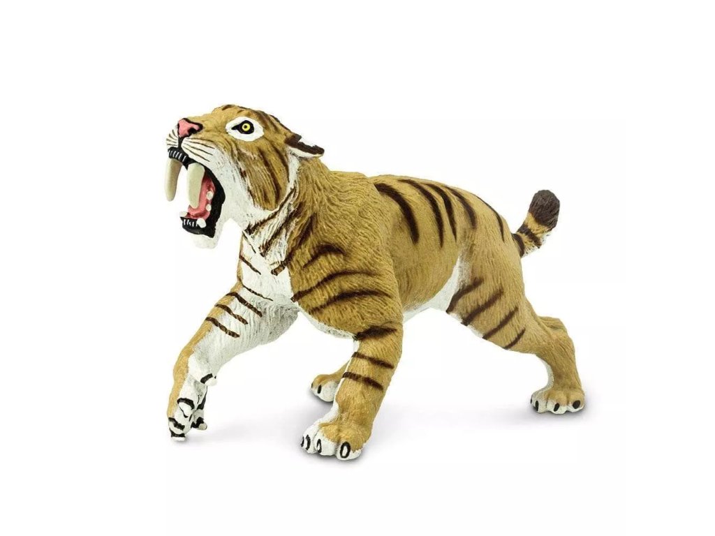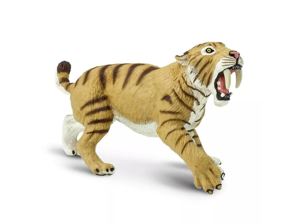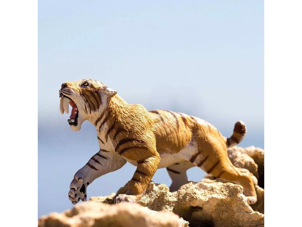 Model de tigru cu dinți de sabie, felină dispărută, cunoscută pentru colții săi masivi. Tigrul cu dinți de sabie a locuit în America de Nord și de Sud și a dispărut acum aproximativ 12.000 de ani.