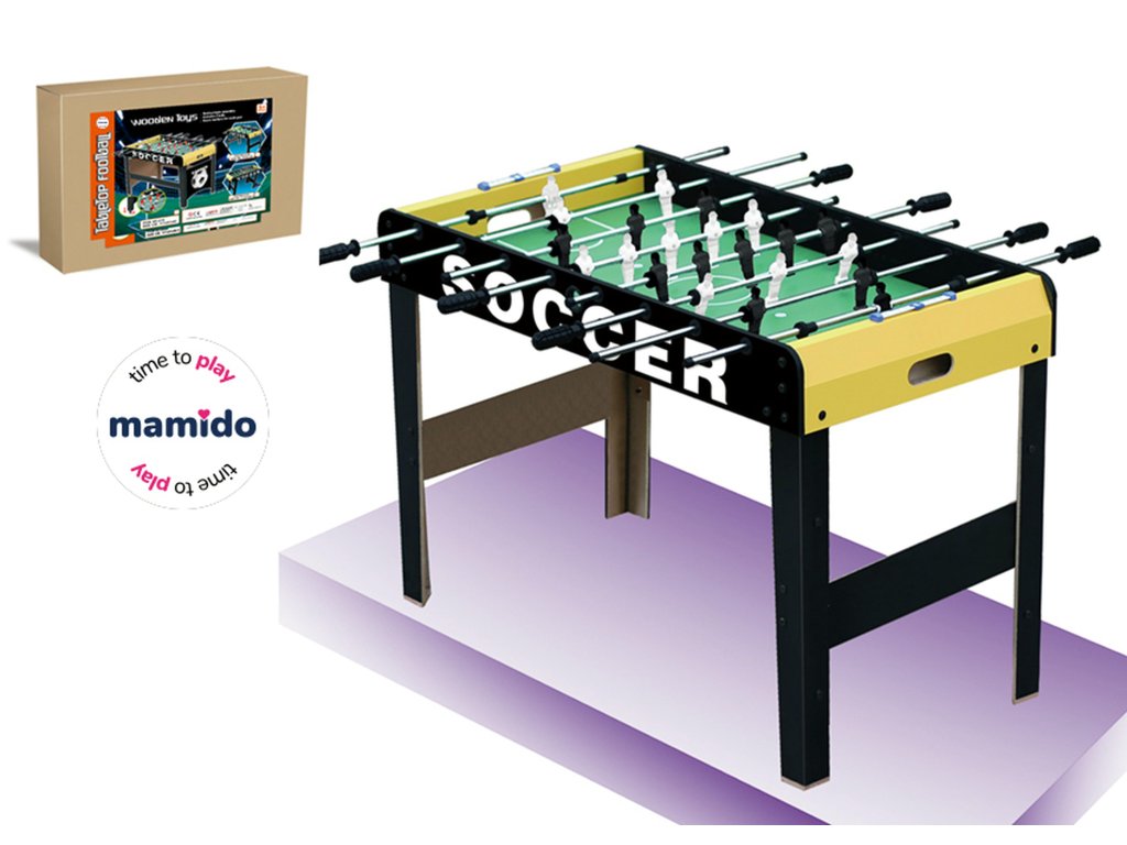 Construcția mesei de fotbal este concepută pentru un joc sigur și confortabil – picioare stabile, decupaje laterale pentru transport și o suprafață de joc netedă care amintește de un teren de fotbal real. Echipele de jucători, diferențiate prin culori, sunt distribuite uniform pe barele rotative cu mânere ergonomice, datorită cărora figurile sunt ușor de controlat. Contoarele manuale de goluri permit urmărirea scorului pe tot parcursul meciului.