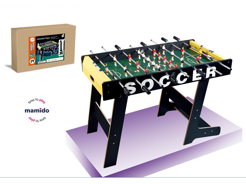 Suprafața de joc este concepută pentru a semăna cu un teren real – cu linii și porți clar marcate. Figurinele de joc sunt aranjate într-o formație clasică de fotbal și sunt ușor de controlat datorită mânerelor confortabile de pe barele rotative. Picioarele stabile asigură un joc sigur, în timp ce un contor manual de goluri de la fiecare poartă permite urmărirea scorului în timpul unui meci palpitant.