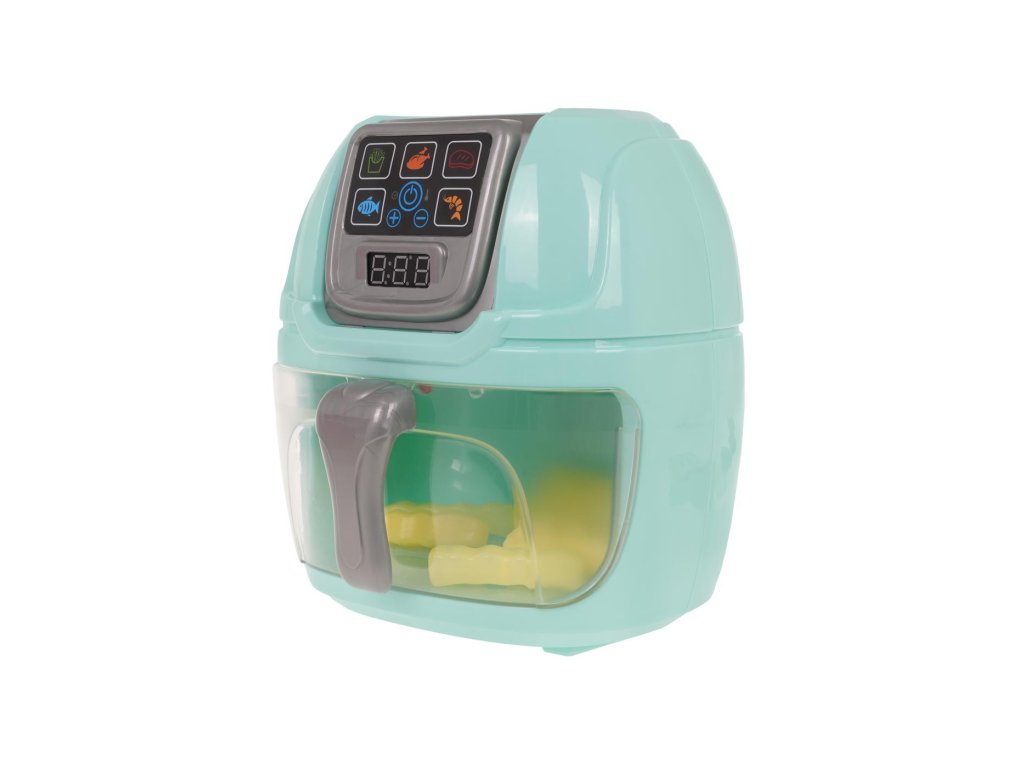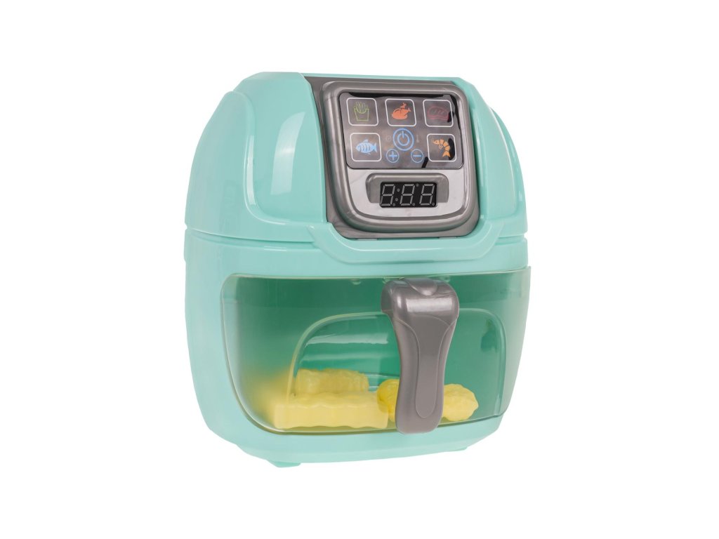 Friteuza interactiva cu aer cald cu efecte de sunet si lumina pentru copii de la 3 ani . Jucaria a fost realizata din cele mai bune materiale cu atentie la detalii. Afișajul arată timpul de gătire al preparatului dat. O altă caracteristică interesantă a jucăriei este că manechinul alimentar introdus în ea își schimbă culoarea datorită luminilor LED situate în partea superioară a friteuzei. Setul vine cu accesorii precum clești, cartofi prăjiți, betisoare și farfurii.