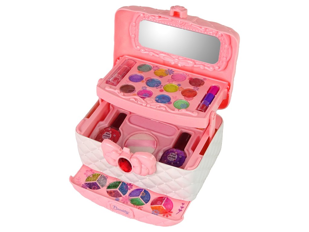 Jucăria ideală pentru micuții iubitori de machiaj. Carcasa este realizată din plastic ușor, ceea ce o face ușor de transportat. În plus, are un mâner, astfel încât să-l poți lua oriunde. Este decorata cu o fundita draguta in fata, care ii confera un farmec feminin.