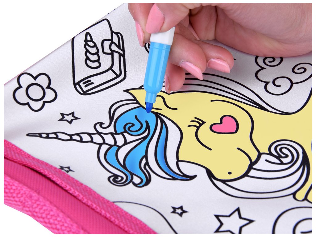 Geanta de pictură cu unicorn este concepută pentru fiecare mic artist căruia îi plac lucrările de artă. Trebuie să pictezi singur geanta, după propria idee și imaginație. Graficul negru înfățișează un unicorn drăguț cu stele, nori, flori și alte elemente de basm. Sarcina micului artist este să picteze geanta astfel încât să fie unică și inimitabilă. Pentru aceasta vor fi folosite stilourile incluse în set.